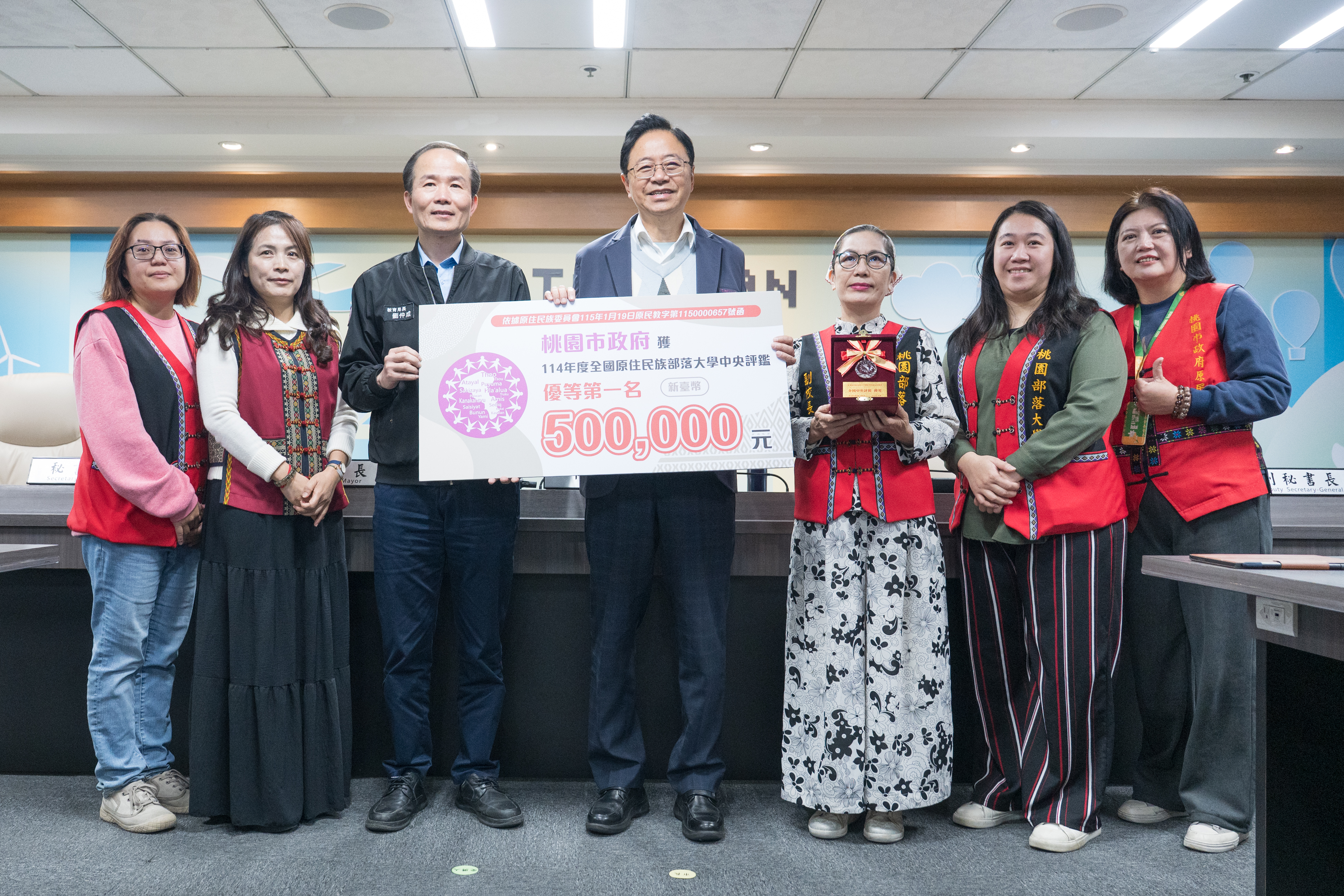 桃園市長張善政今(11)日上午主持市政會議,接受原民局呈獻榮獲原住民族委員會「114年度原住民族部落大學評鑑計畫」優等(第1名)獎項。張市長表示,桃園因具備多元的就業機會,吸引許多原民朋友選擇在此定居,使桃園原住民族人口持續成長,未來極可能超過花蓮縣,成為全臺原住民族人口最多的城市。市府亦期盼透過部落大學持續深化教育培力,協助族人充實自我。