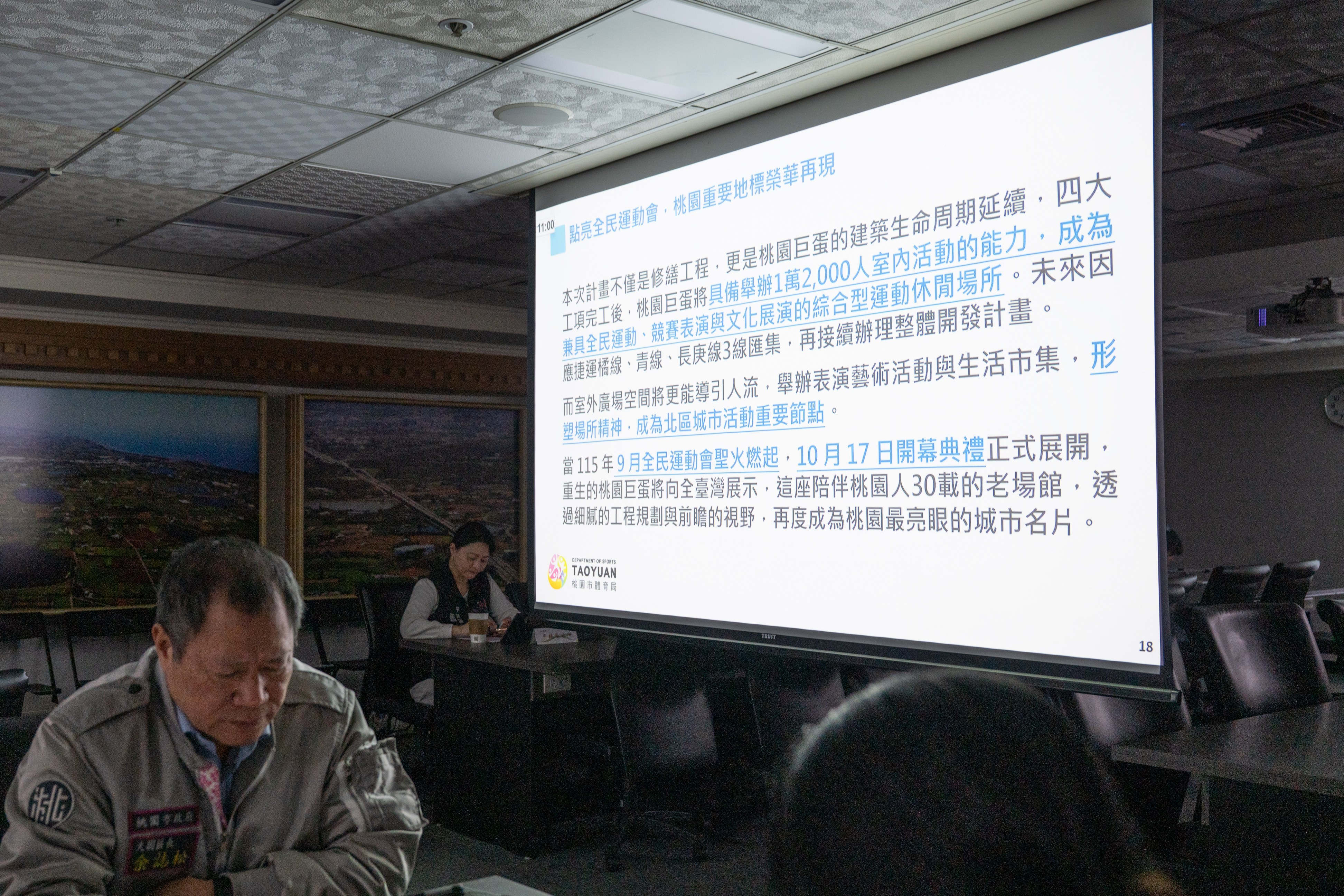 體育局長許彥輝表示,桃園巨蛋啟用逾30年,部分設施已難完全符合現行國際賽事規範,市府因此推動整修計畫,全面提升場館設施與使用體驗,並同步擴大周邊公共空間的活動機能。此外,今(115)年全民運動會將於10月17日在桃園巨蛋舉行開幕典禮,整修完成後,場館將以嶄新面貌迎接賽事並服務市民。