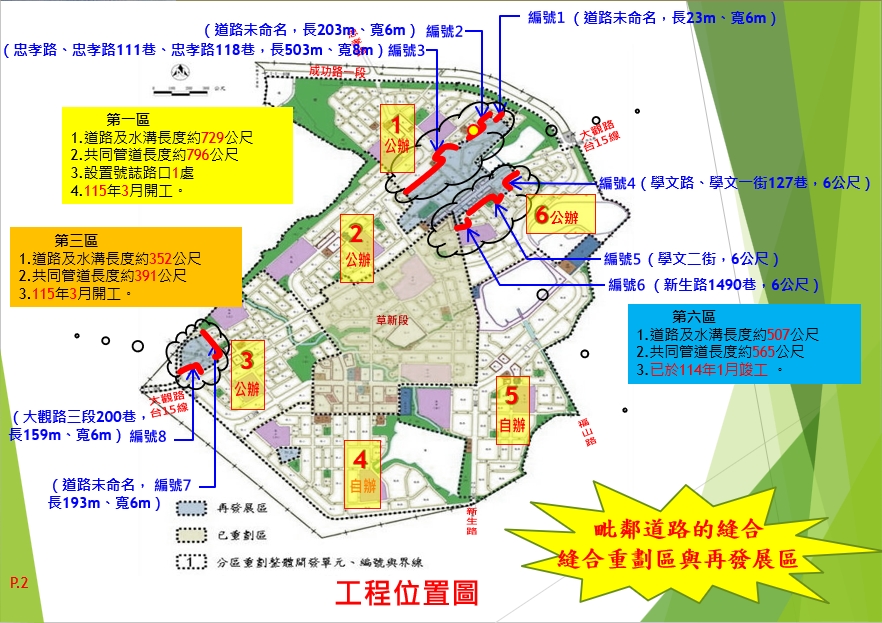 草漯第一、三、六區完成市地重劃後,部分位於重劃範圍外之周邊再發展區,其毗鄰之計畫道路尚未全面開闢,致使部分道路僅完成半幅,不僅影響通行順暢及用路安全,亦限制區域整體發展。為改善道路瓶頸問題,市府整合相關資源,推動毗鄰道路開闢計畫,補齊道路斷點,強化市地重劃區與周邊發展區之道路系統銜接與縫合,全面提升都市計畫道路之服務機能;其中,第六區毗鄰道路工程已於114年1月率先完成,開闢計畫道路寬度6公尺道路3段,道路及水溝長度約507公尺,共同管道長度約565公尺,有效改善周邊交通動線並提升用路安全。