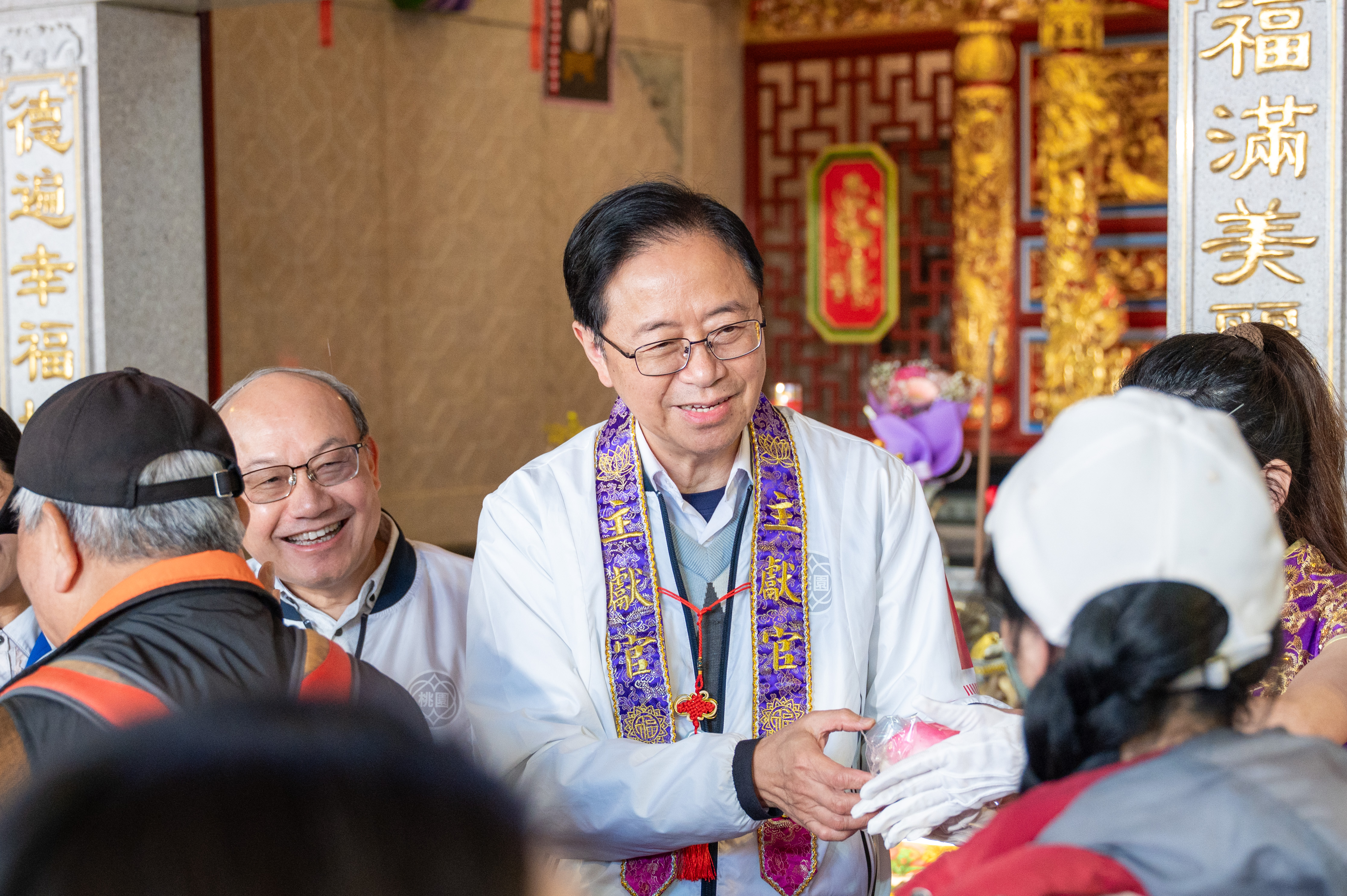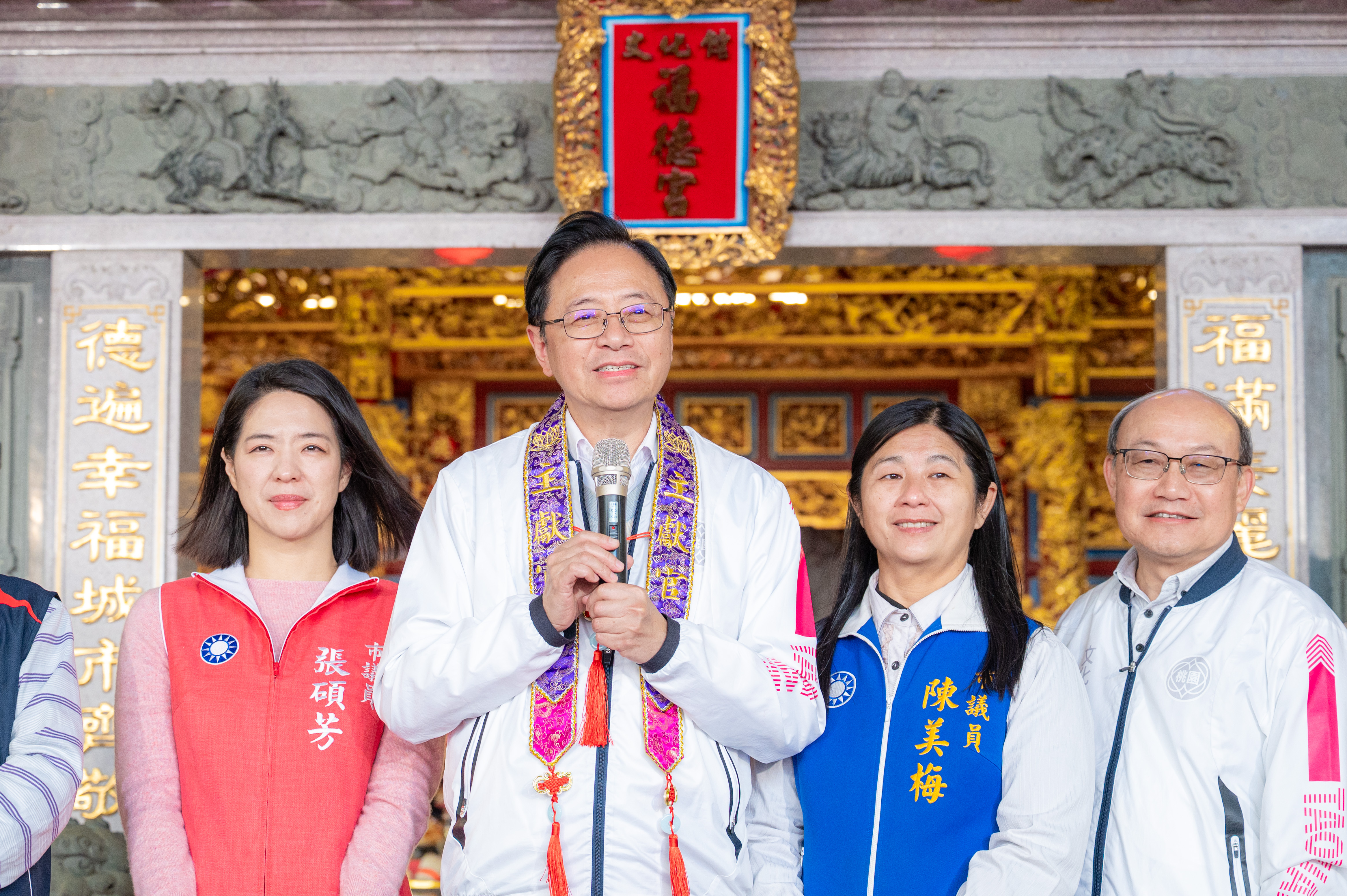 今日包括市議員陳美梅、張碩芳,市府文化局長邱正生、桃園區長許敏松、桃園信用合作社理事主席蘇家明、桃園大廟景福宮主委簡征潭、總幹事李詩明、中壢仁海宮副董事長鍾福晉、桃園市土地公文化教育基金會執行長陳正釗、桃園市土地公信仰協會總幹事黃進仕、正一道教桃園妙應壇道長許少豪等均一同出席。