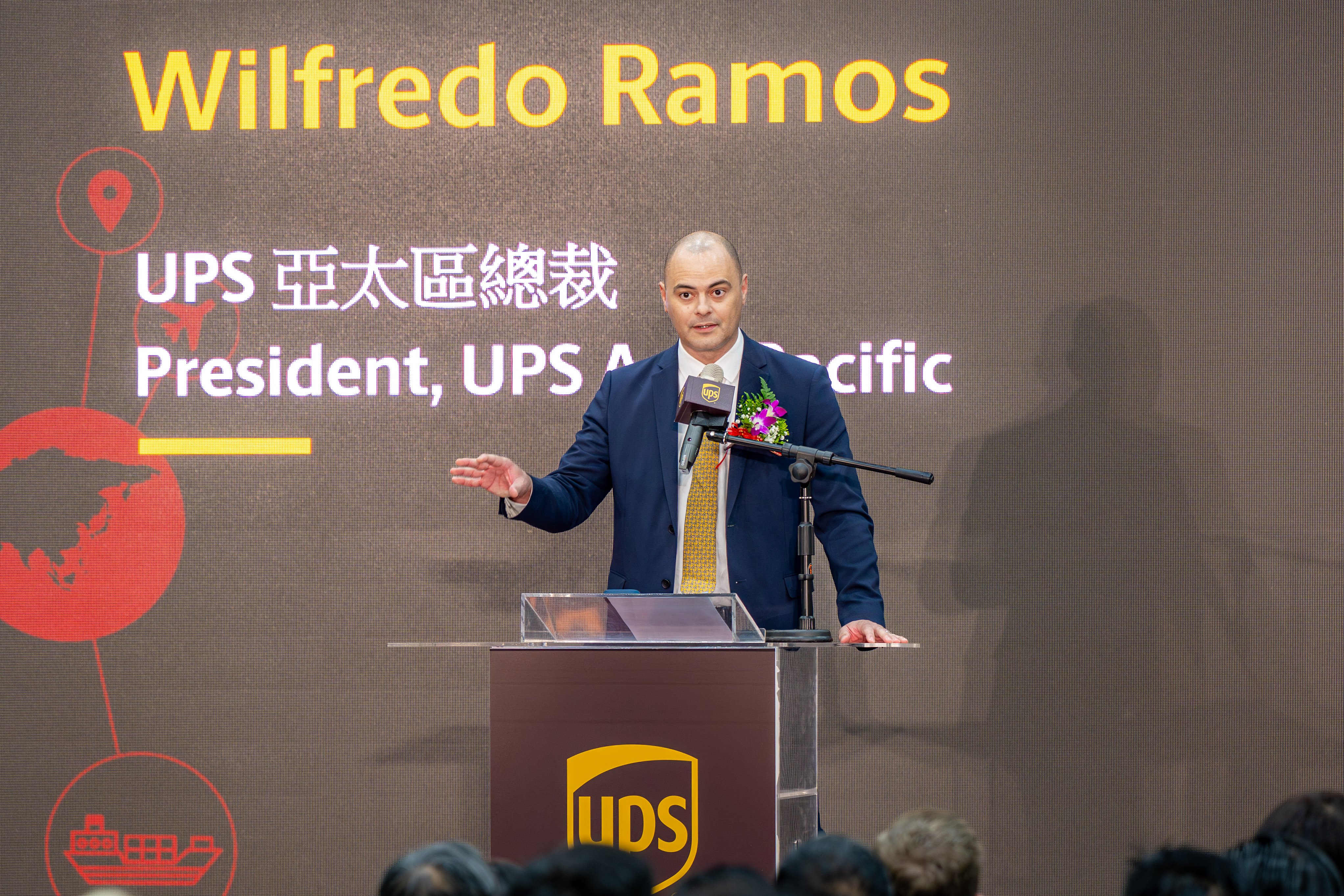 今日包括UPS亞太區總裁 Wilfredo Ramos、UPS亞太區供應鏈及貨運承攬部總裁趙莉、經濟部政務次長江文若、投資促進司副司長呂貞慧、財政部關務署台北關務長黃漢銘、美國在台協會經濟組組長 Eric Frater、台灣美國商會執行長Carl Wegner、應用材料公司企業副總裁Bob Davis、集團副總裁翁佳宗、市府經發局專門委員林文閔、蘆竹區長李岳壇、桃園機場公司董事長楊偉甫等均一同出席活動。