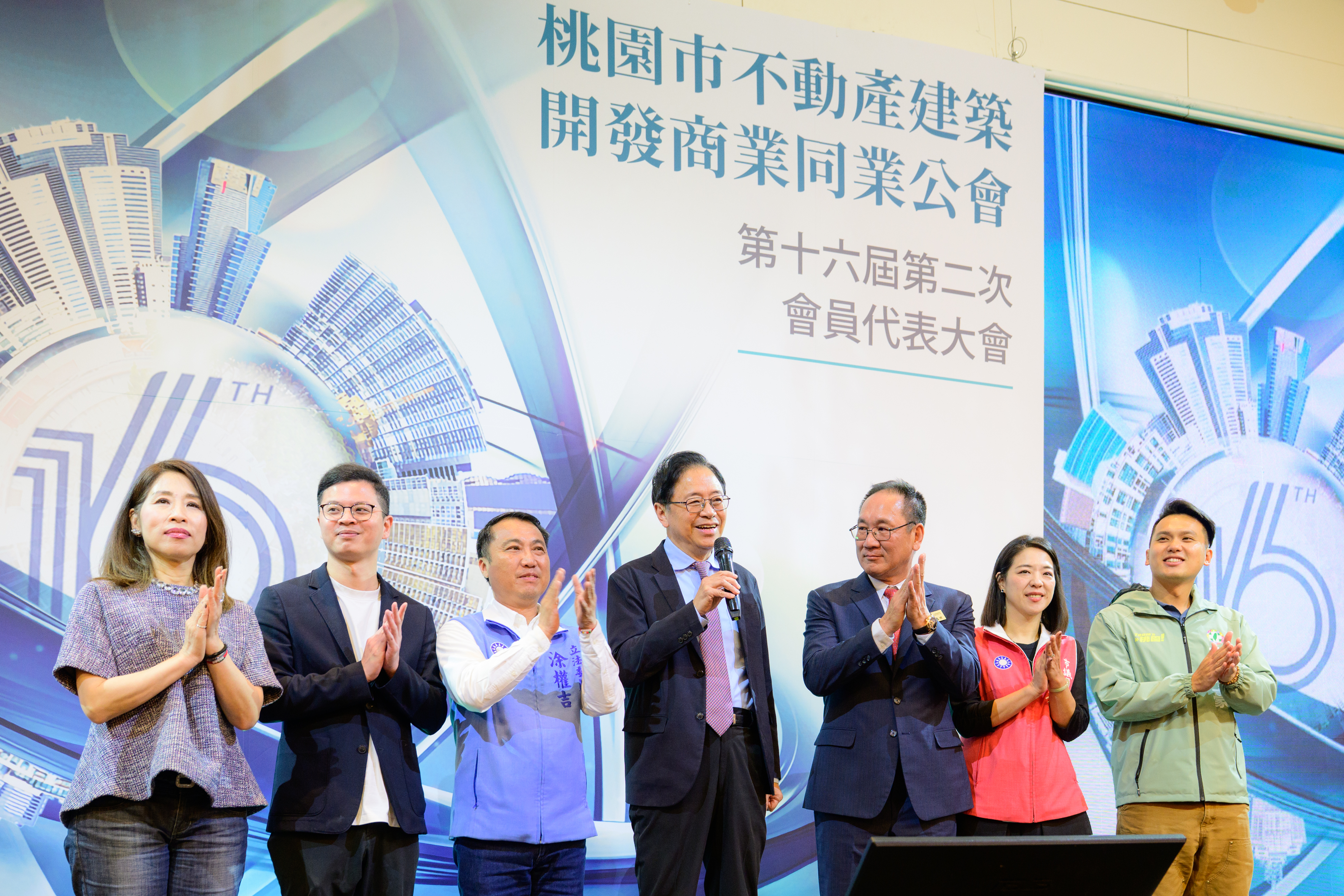 桃園市長張善政今(26)日晚間前往桃園區,出席「桃園市不動產建築開發商業同業公會第十六屆第2次會員大會」。張市長表示,不動產業為城市發展的重要動能,桃園近年快速成長,有賴業界長期投入與專業支持。市府未來將持續與公會緊密合作,推動都市建設與整體發展,提升城市競爭力與居住品質。