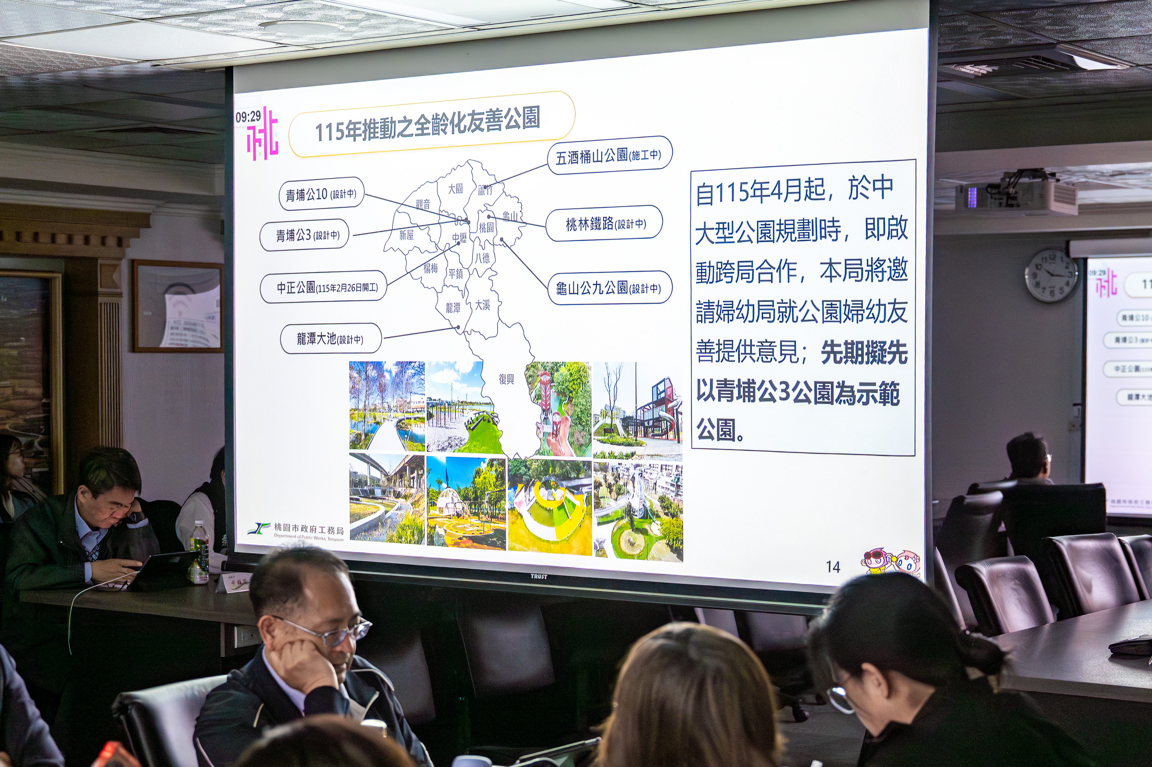 副秘書長金志聿表示,市府目前透過「樂桃園PARK GO」及「FUN遊桃園‧玩公園」等多元管道提供公園資訊,建議未來進一步強化跨平台資訊整合,確保各網站內容即時更新且同步串接,藉此消弭資訊落差,提供市民更完整、豐富且精確的公園導覽服務。