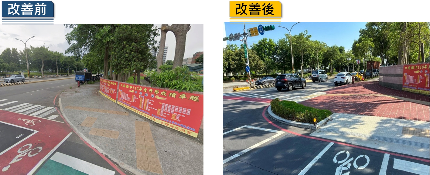 本次桃園市入選案件特色鮮明,充分展現市府團隊提升步行品質與人行安全的決心。其中,養護工程處辦理的「桃園市桃園區人本示範道路-桃園火車後站周邊道路多目標改善工程」,針對大林路、建國路等重要路段全面優化照明,並將「雙色溫路燈」政策帶入這個場域,讓路口更明亮安全,並利用行人友善路口設計、調整人行道轉角半徑、行穿線退縮、縮短行穿線距離、建置安全停等空間;「桃園市中壢區人本示範道路-龍慈路(龍岡路三段-中山東路三段)人本環境多目標改善工程」將人行道轉角半徑優化及增加無障礙坡道,並設置行人庇護島及增設路口植栽槽,讓行穿線遠離路口,營造安心的漫步環境;此外,龜山區大崗國中及桃園區舊司法園區的周邊環境改善工程,皆以人本為核心,透過空間配置調整,建構安全且無礙的步行城市環境。
