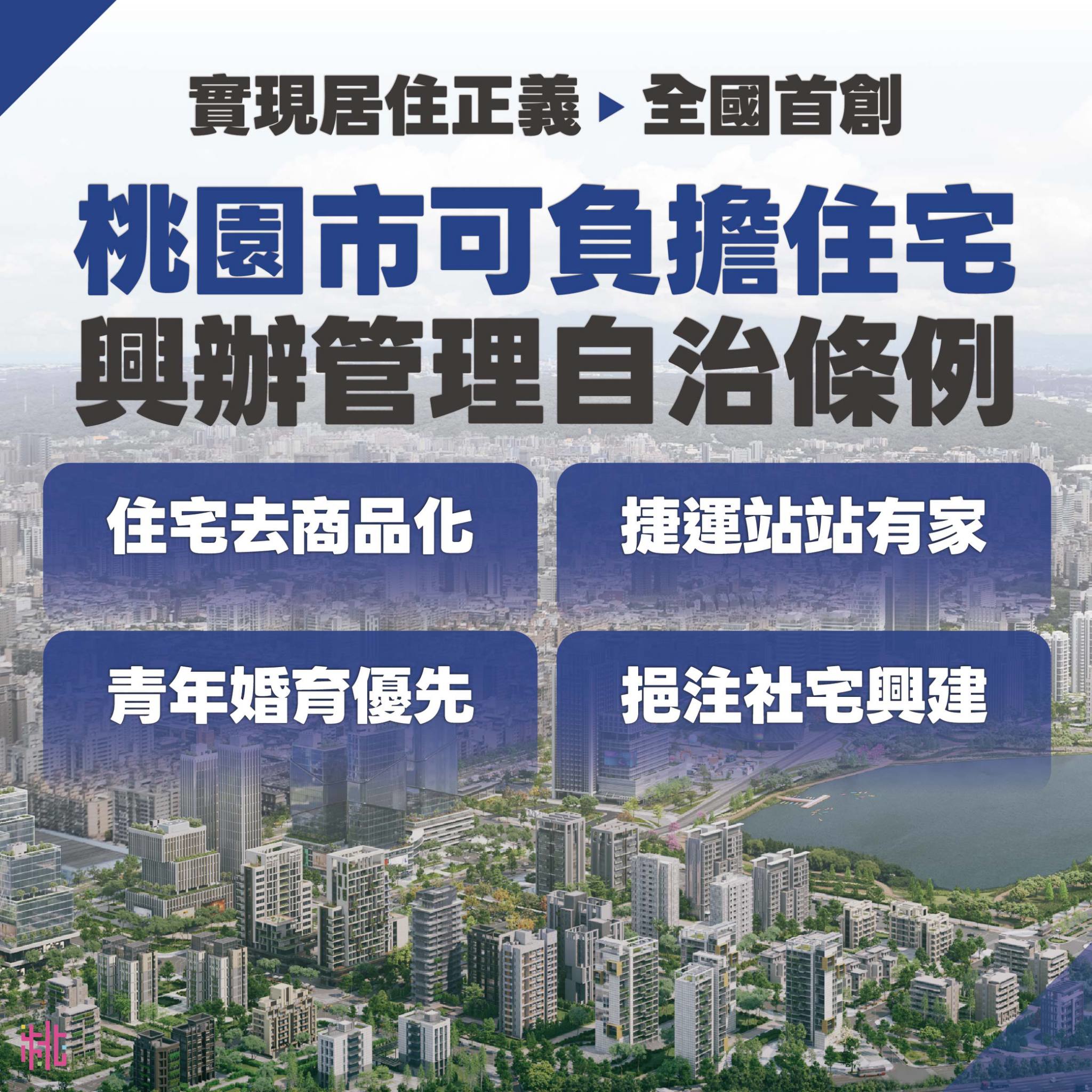 桃園市長張善政今(15)日上午主持市政會議,通過《桃園市可負擔住宅興辦管理自治條例》草案,預計本周五(17日)前送交議會審議,力拚5月下旬通過,並於7月報請內政部核定。張市長表示,此條例為全國首創可負擔住宅制度,透過建立政府主導的居住支持機制,在高房價與租屋不穩定之外,提供市民多元且可負擔的居住新選擇。
