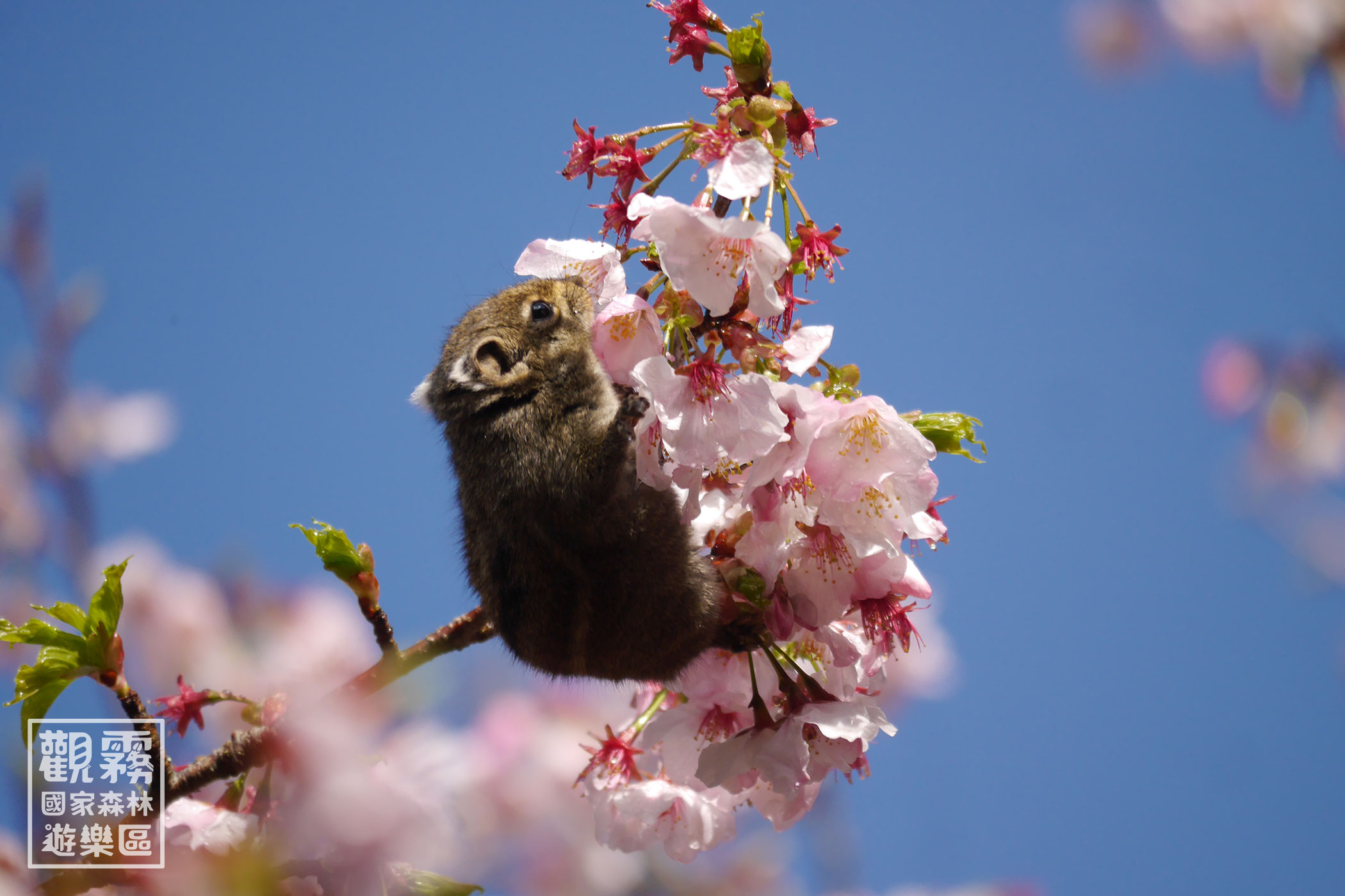 04_櫻花樹上的雜技演員條紋松鼠以倒掛、劈腿的矯健身手深入花叢,享用櫻花大餐。(森之形自然教育團隊提供;劉謹毓攝影)