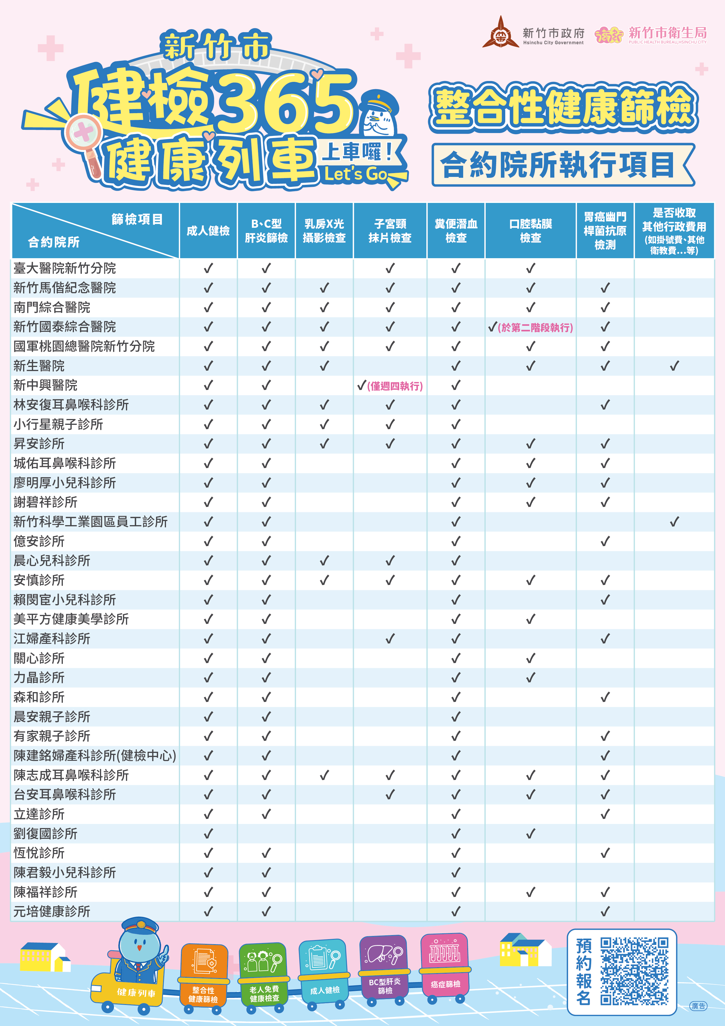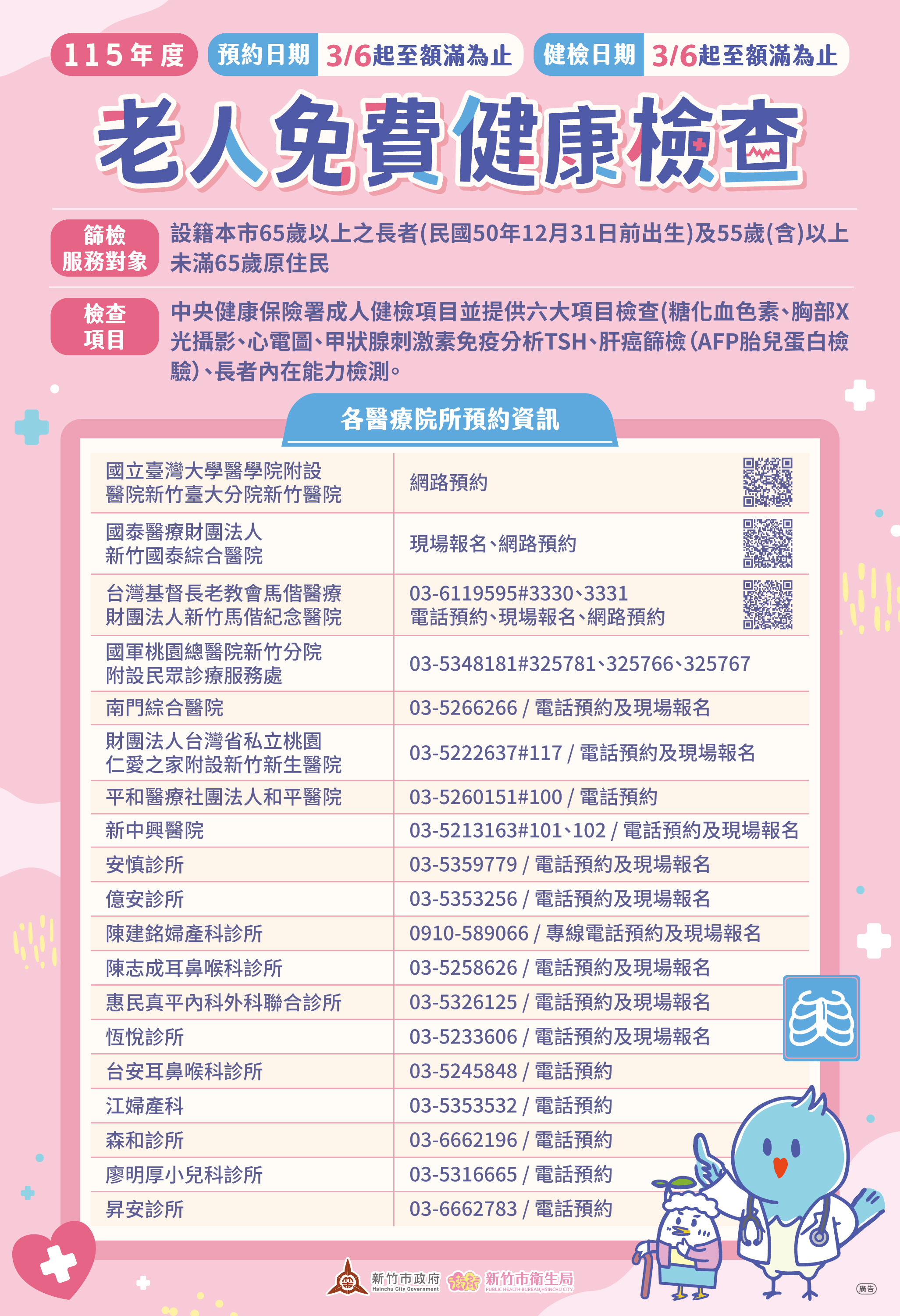新竹市政府3月6日在新竹市北區衛生所舉辦「健檢365健康列車」發布會,由市長高虹安宣布活動正式開跑!高市長表示,今(115)年度首次結合竹市整合性健康篩檢及老人免費健康檢查資源,並攜手竹市34家合約院所,共同打造更貼近市民需求的篩檢模式,提供包含社區型、醫院型、診所型及衛生所型等多元場次。凡30歲以上(民國85年前)設籍竹市市民提供每年定期篩檢,並享擴大免費大腸癌篩檢服務(定量免疫法糞便潛血檢查)及免費早餐(或早餐券);另65歲以上(民國50年前)長者及55歲以上(民國60年前)原住民自即日起,可向合約醫療院所報名參加老人免費健康檢查,額滿為止。