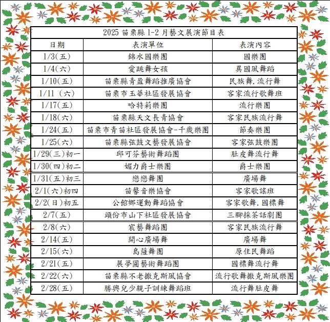 為提供縣內藝文團隊展現才華機會,並增進民眾欣賞多元表演的文化體驗,苗栗縣政府文化觀光局今年援例於1月3日起至12月31日(每週五、六)晚上7時至8時,在苗栗後火車站西站外廣場舉辦藝文展演,並於大年初一至初五(1月29日至2月2日)農曆春節加碼安排一系列精采的表演,誠摯邀請大家一同感受熱鬧氛圍,欣賞精采藝文展演!