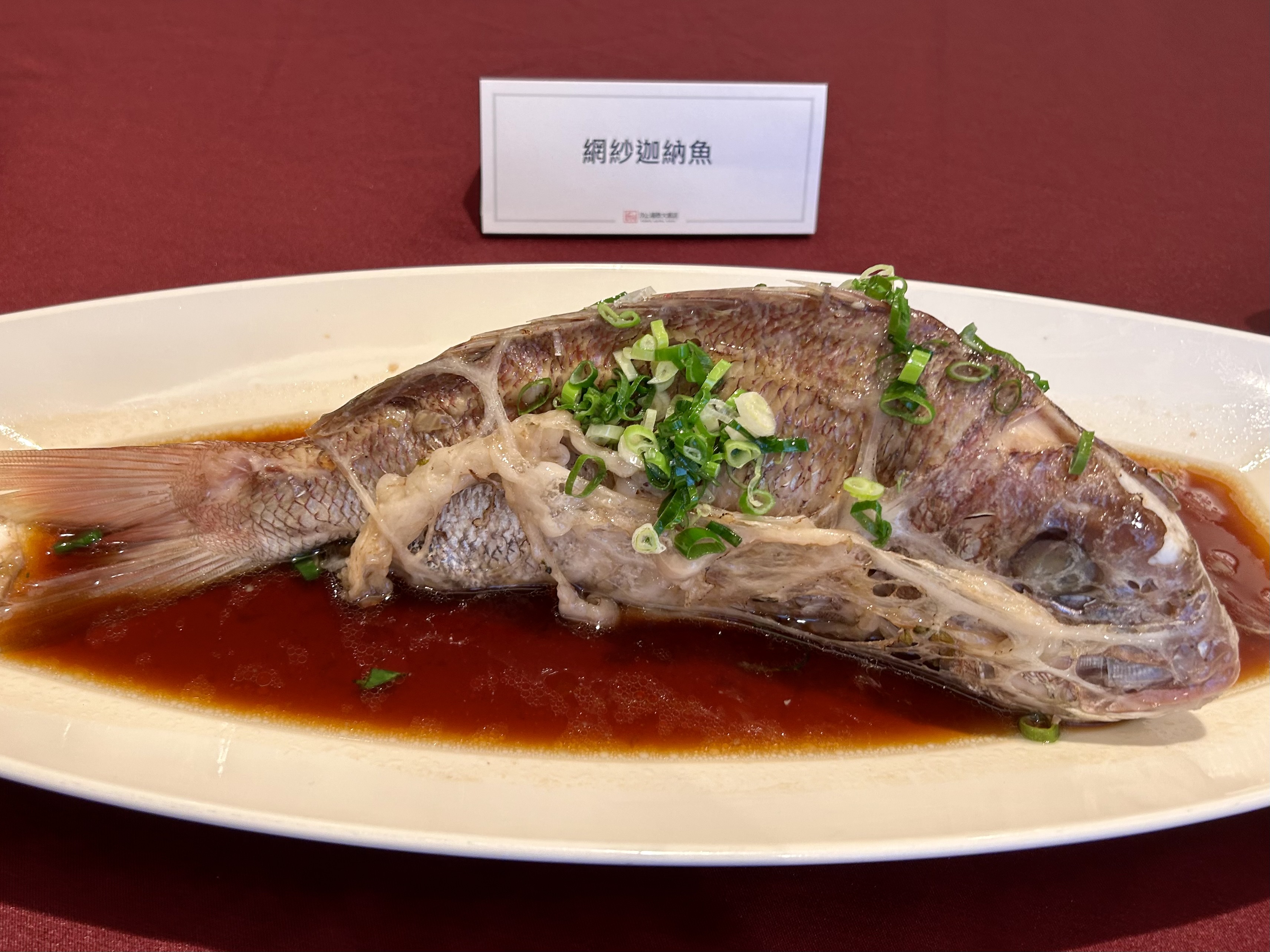 [網紗迦納魚] 主廚嚴選每尾重約1.2公斤的迦納魚,從魚腹處巧手去骨去刺,保留整尾外型,體現古法「布袋雞式」包覆技法。魚腹內餡則以苗栗在地福菜與手切肉絲拌炒,炒香後重新填入魚腹,鹹香馥郁、層次分明。外層包覆一層「網紗油」,在蒸煮過程中釋出油香,使魚肉更顯潤口滑嫩。