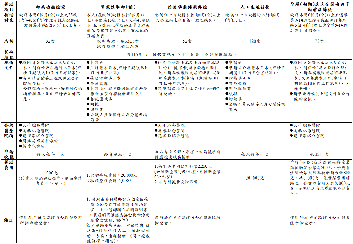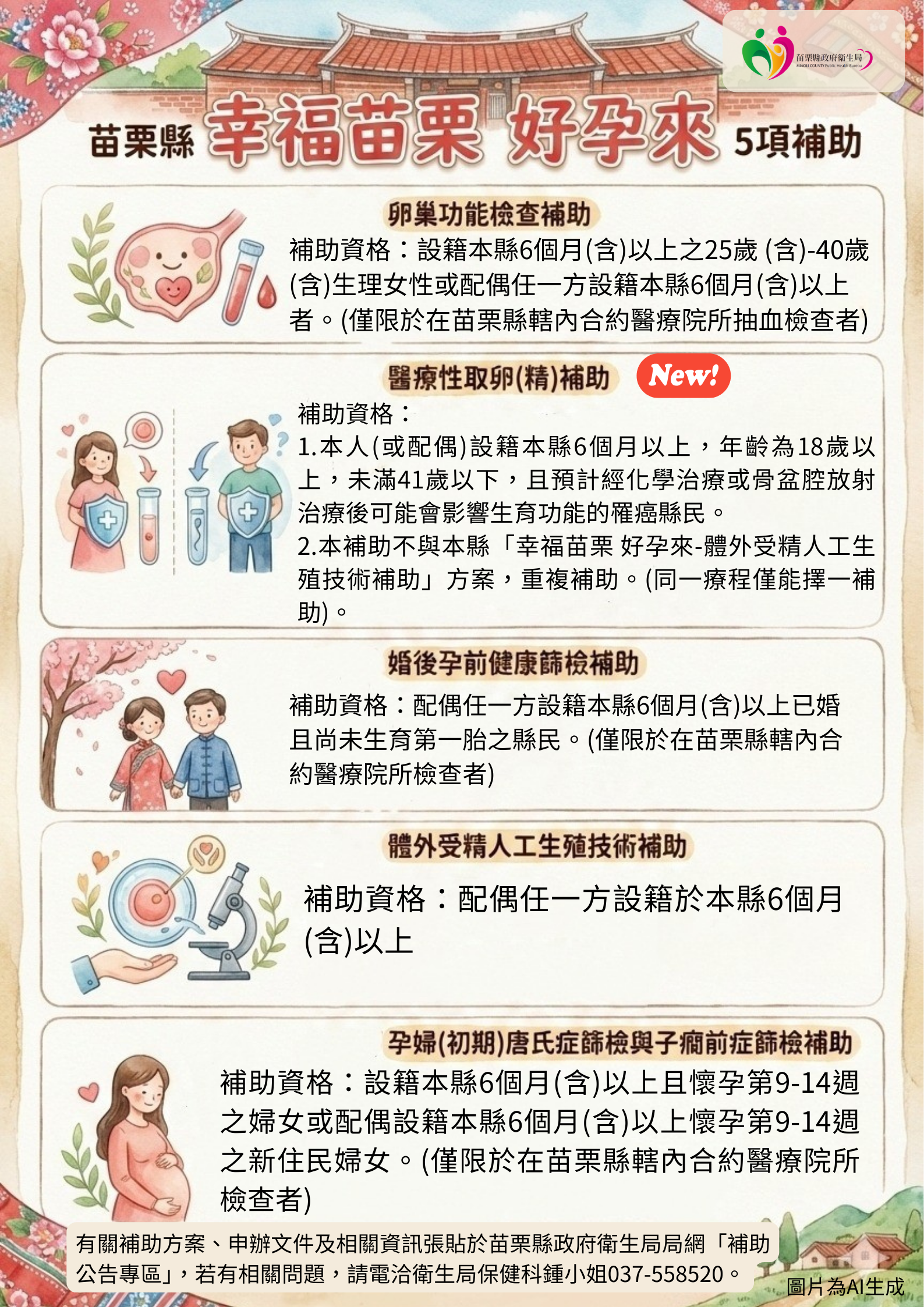 為保障本縣民眾生育權益,協助因罹癌需接受治療影響生育力之患者,苗栗縣政府自115年1月1日起「幸福苗栗 好孕來」推動「醫療性取卵(精)補助」。