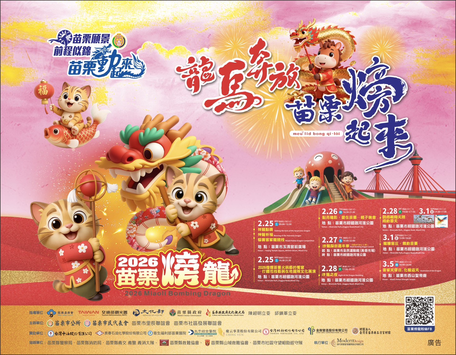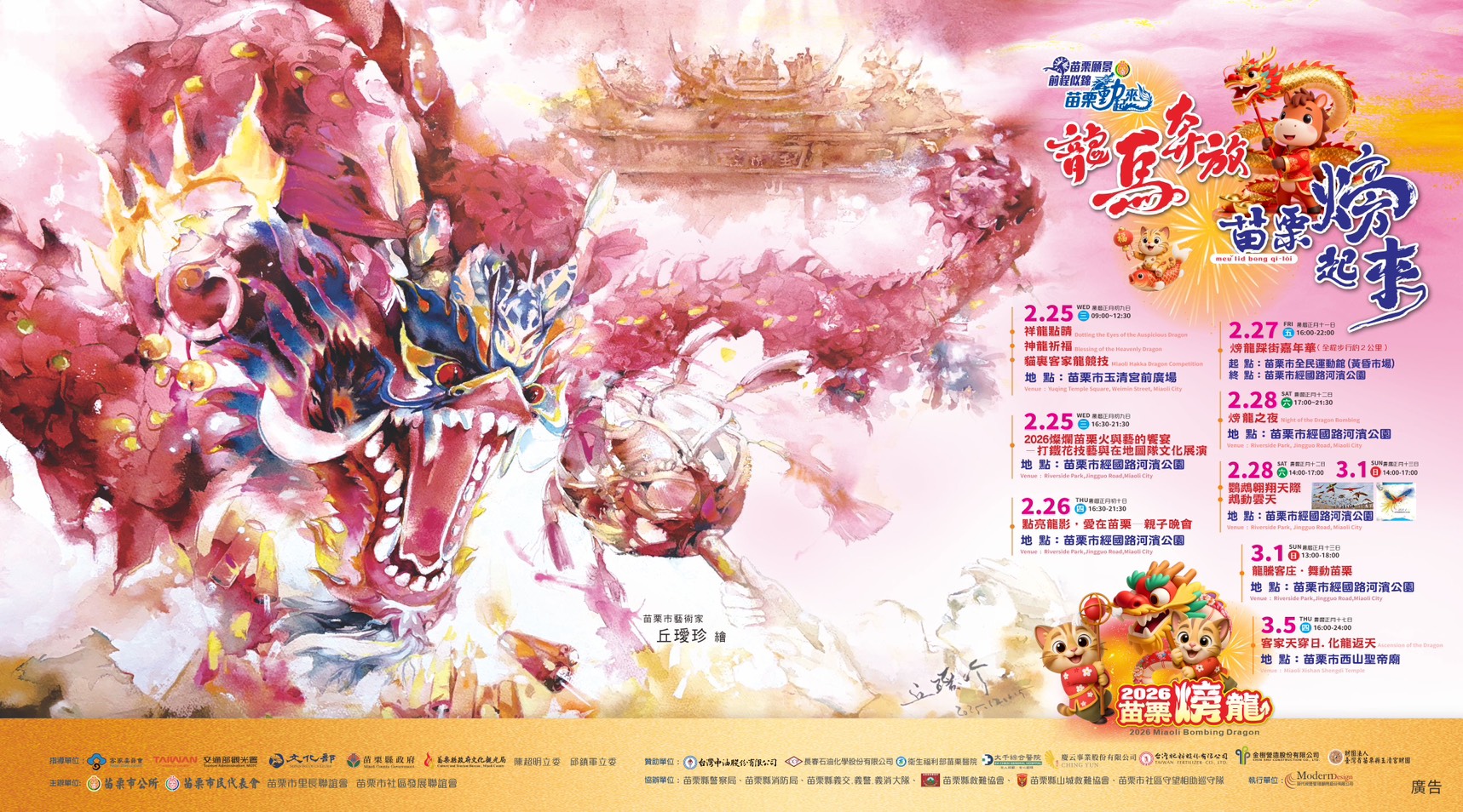 「2026苗栗𪹚龍系列活動」將於2月25日在苗栗玉清宮舉辦「祥龍點睛」、「神龍祈福」及「貓裏客家龍競技」;2月27日於苗栗經國路河濱公園舉辦「火旁龍踩街嘉年華」;2月28日同樣於經國路河濱公園登場「火旁龍之夜」;3月5日在苗栗西山聖帝廟舉辦「化龍返天」儀式。其中「火旁龍踩街嘉年華」與「火旁龍之夜」為年度重點活動,結合傳統民俗、表演藝術與節慶氛圍,深受在地民眾與遊客期待。