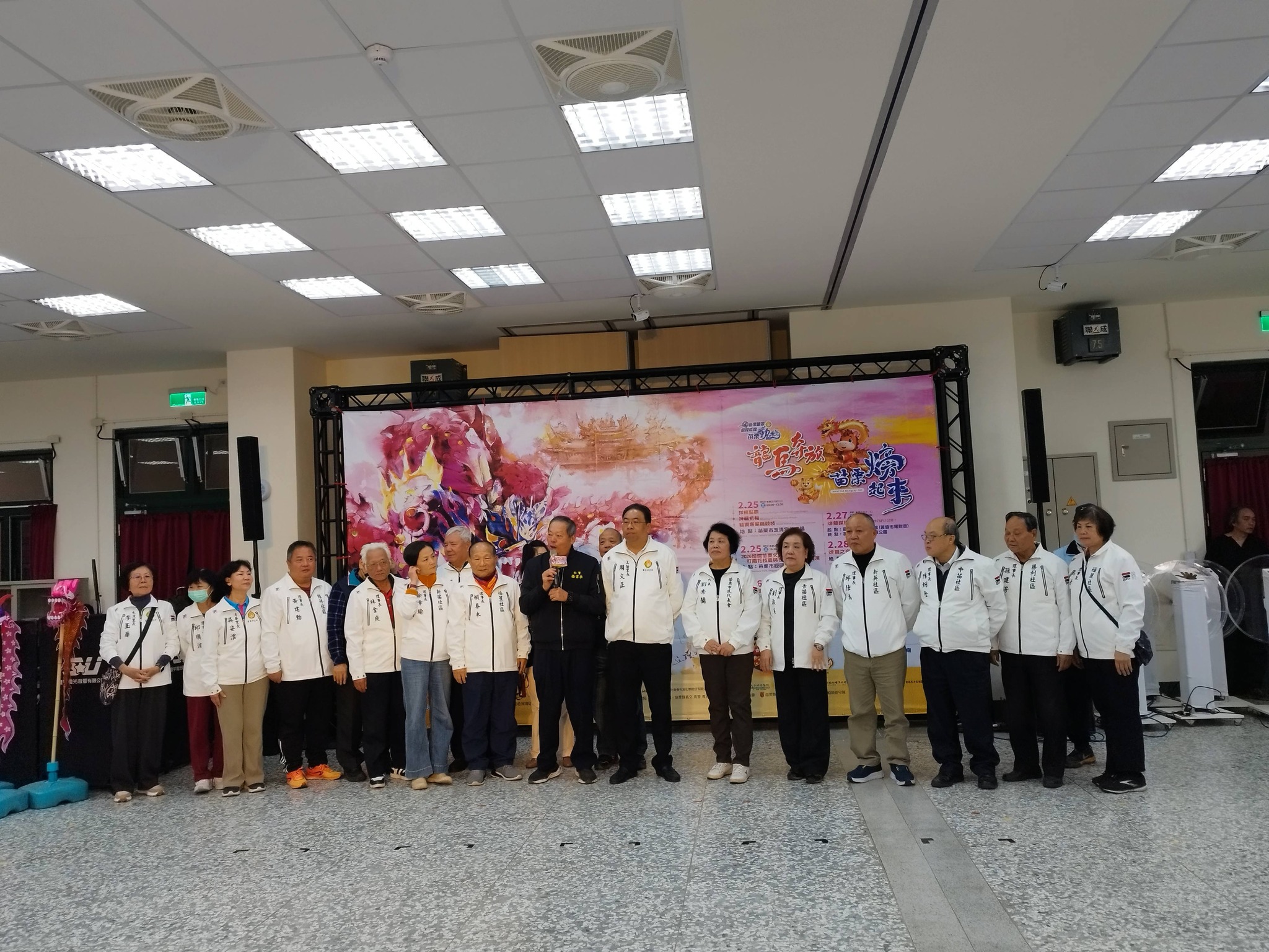 苗栗市公所1月3日於嘉盛嘉新活動中心舉辦「2026苗栗火旁龍系列活動」宣傳記者會,苗栗市各社區祥龍齊聚,群龍聚首、氣勢磅礴,正式宣告年度火旁龍盛事啟動。今年適逢馬年,以「吉馬接火旁」為主題,象徵在火旁龍文化薪火相傳之際,由吉馬接棒延續祝福與希望,祈求新的一年平安順遂、好運不間斷。