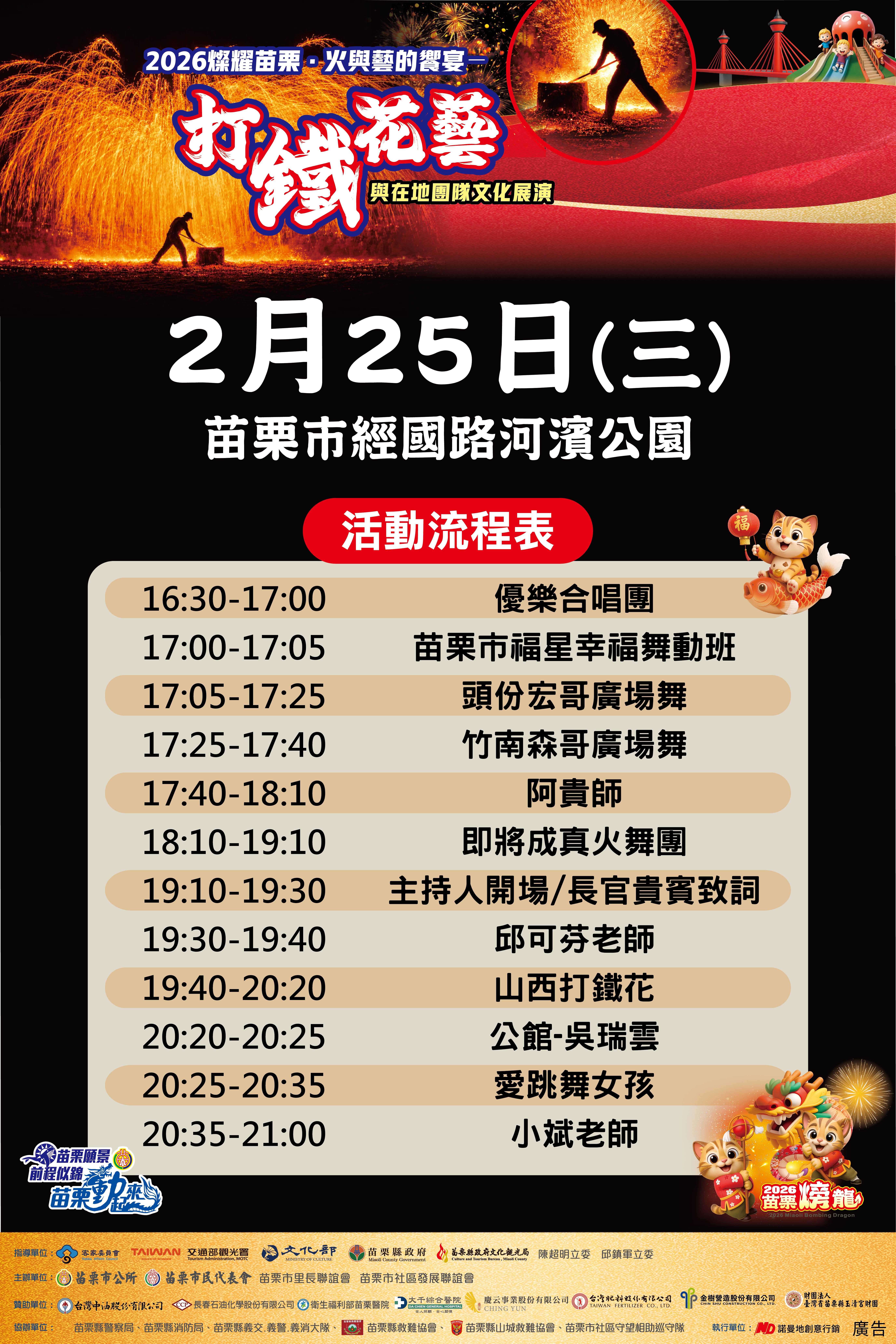系列活動將於2月25日率先在苗栗市經國路河濱公園震撼登場,當晚以「火」為文化核心意象,打造一場跨越地域與藝術形式的火焰盛典。