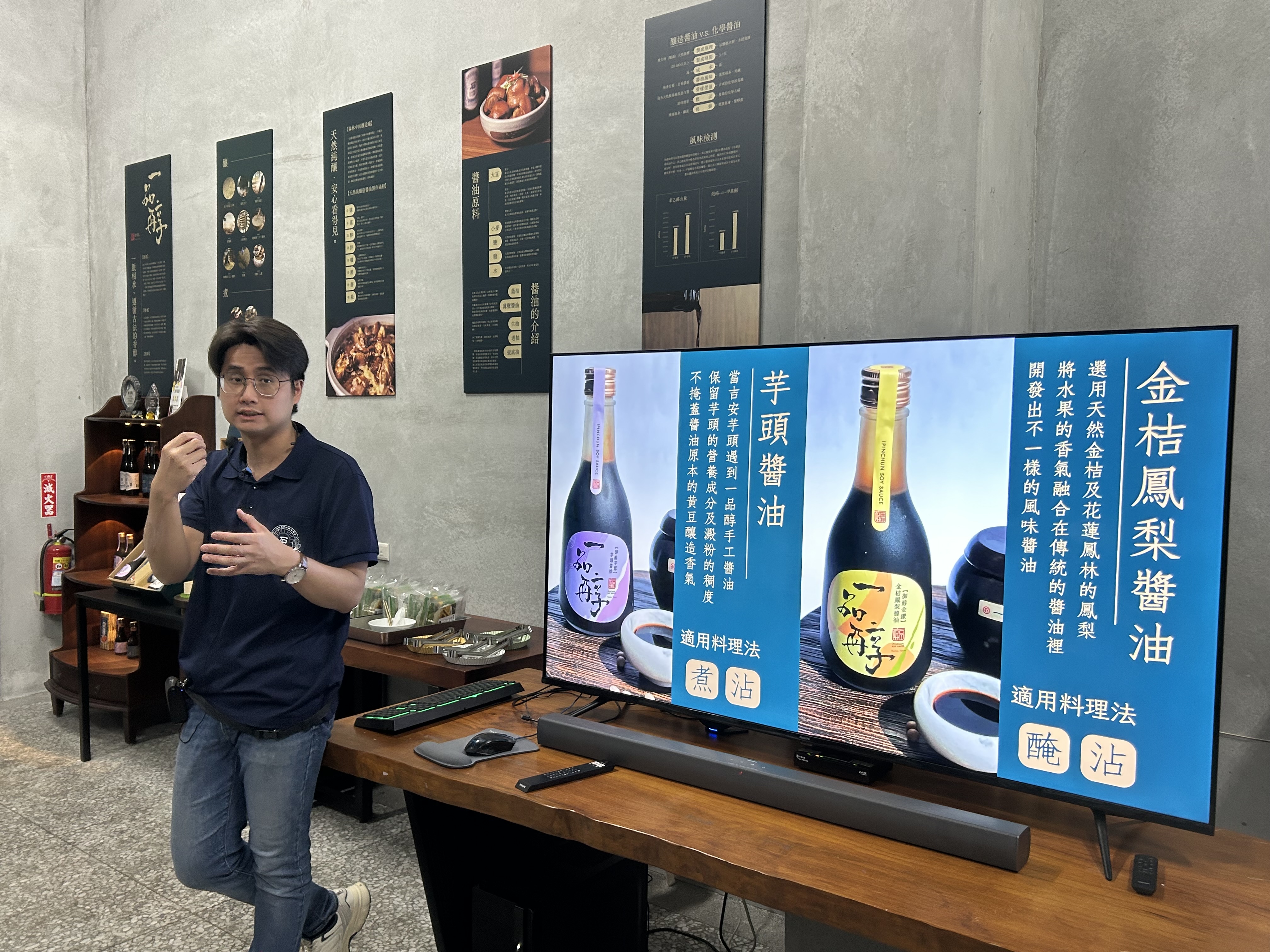 晚間參訪花蓮知名釀造品牌「一品醇醬油」。品牌堅持陶甕日照自然發酵、使用非基改黃豆,並維持傳統工序製成白瓶家傳醬油、藍瓶老饕醬油、黑金五年醬油等系列產品。透過導覽,團員深入了解醬油從原料、曝曬到淬釀的細緻工法,並與品牌探討未來在聯名商品、伴手禮設計及食農課程上的合作可能。