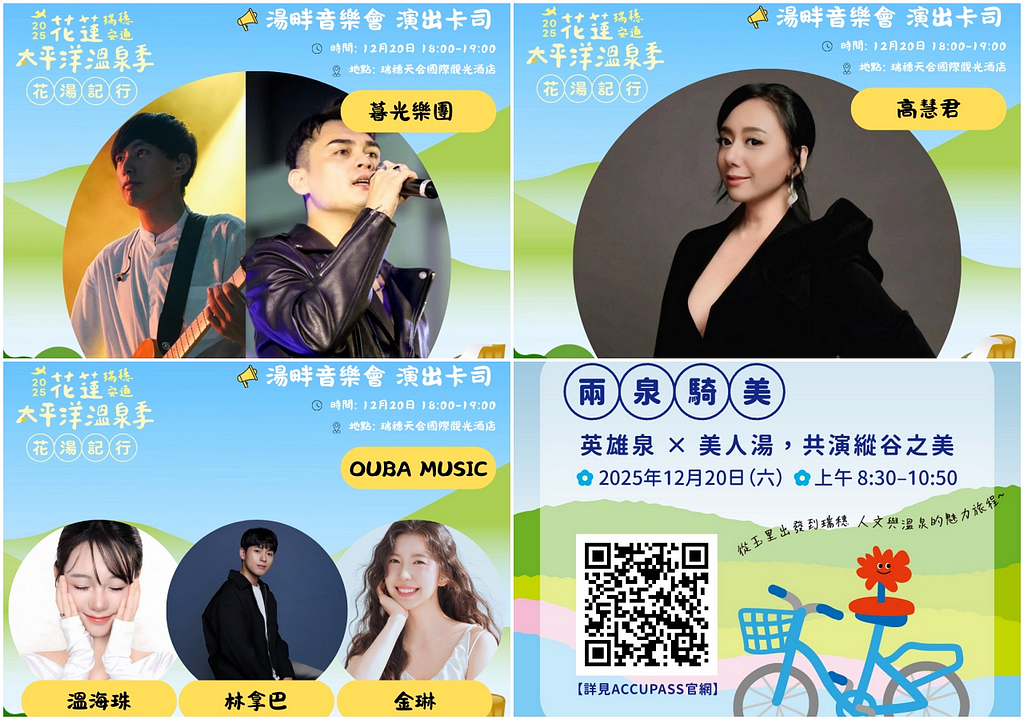 2025花蓮太平洋溫泉季自11月22日起跑,活動進入倒數壓軸,花蓮縣政府將於本周六(12月20日)推出結合音樂、市集、騎旅與泡湯回饋的系列活動,邀請民眾白天騎進縱谷、夜晚走進溫泉,用一整天的慢旅節奏感受花蓮冬日魅力。