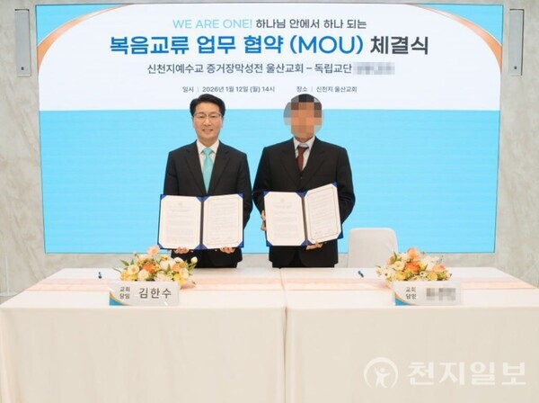 新天地蔚山教會於今年(2026)1 月 12 日,在新天地蔚山教會 3 樓與該獨立教派教會舉行新年首場福音交流 MOU 簽署儀式。雙方在儀式中承諾,未來將以聖經為共同基礎,推動話語交流與相互合作。