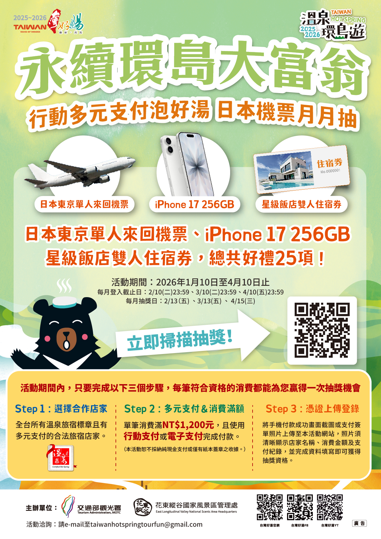 另同步進行的台灣好湯「永續環島大富翁」活動,結合「數位轉型」與「永續旅遊」概念,遊客只要在指定溫泉區消費並使用多元支付方式,即可參加抽獎,有機會抽中日本東京來回機票與最新款iPhone,鼓勵遊客在享受泡湯樂趣的同時,一起響應低碳無現金的永續旅遊新趨勢!