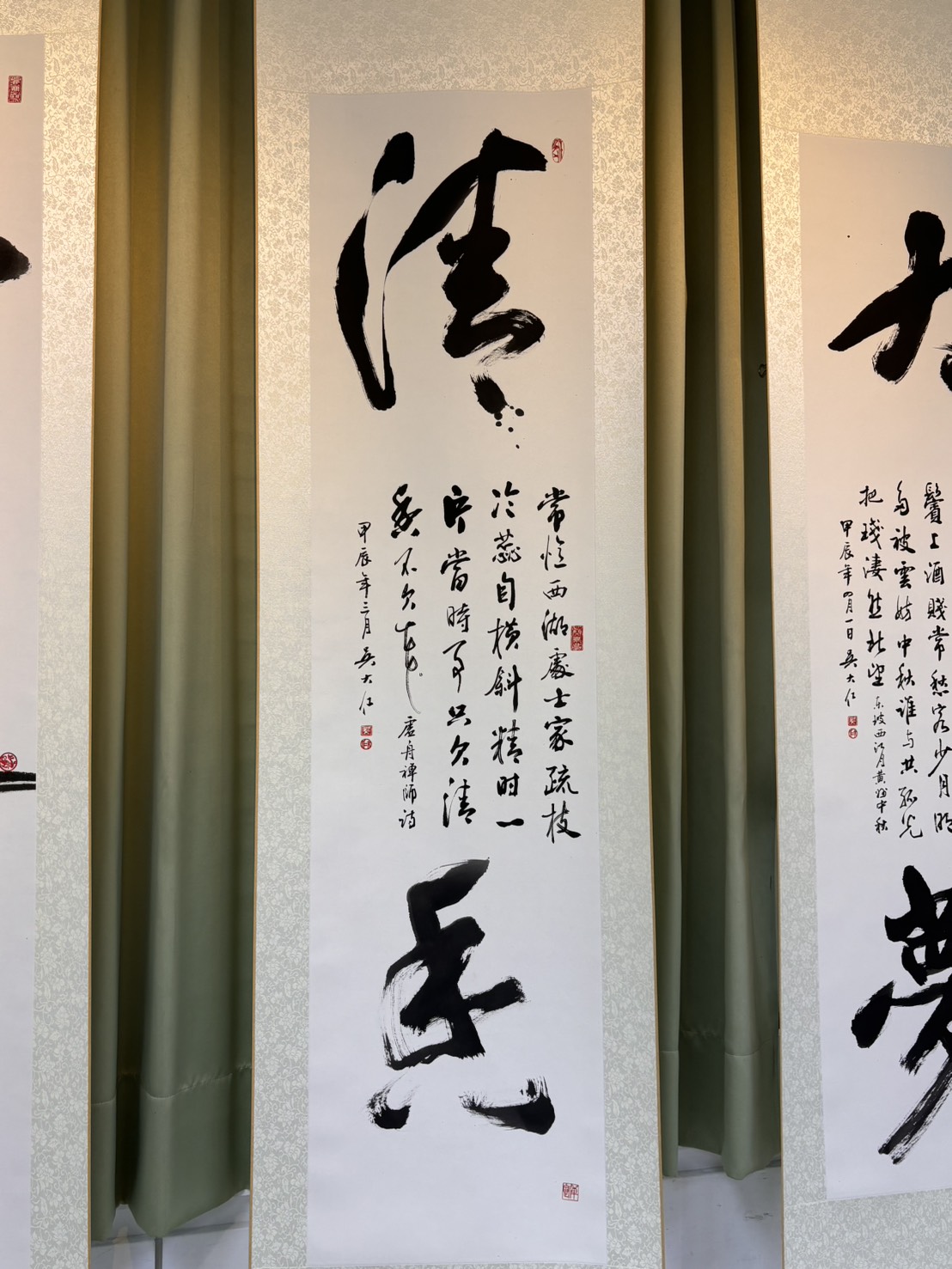 值得一提的是,日前他在書法班展示新作書法「禪茶兩忘」,堪稱經典佳作,禪字右上兩個口字畫上兩位禪僧代之,茶字上方兩畫也以兩隻茶壺替之。一般而言,在畫畫展最常出現的書法作品是「禪茶一味」,在場的學員觀賞「禪茶兩忘」作品後不禁驚呼,「禪茶兩忘」太有創意了,而且這四個字,根本就是空性的境界嘛!也有學員推敲、觀照「禪茶兩忘」與「禪茶一味」之意境區別,認為這是頓悟與漸悟之別。今(24)日上午吳大仁指導的圓光禪寺敦親睦鄰書法班學員張明光、許素秋、陳淑芬、呂雅惠、藍彩玲、楊美鳳等6人,特別自桃園開車前往四結國小「吳大仁書畫展」現場觀展,為恩師加油打氣,並祝福畫展圓滿成功。圓光禪寺水電顧問張明光觀展後高興的說:「吳老師的作品琳琅滿目,有的氣勢磅礡,有的古樸出奇,有的柔情似水,而且幾乎所有的作品都寓有禪意,展現大師的境界,令人讚嘆。」