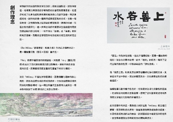 吳軒慧表示,返台後,水墨語彙進一步延展為對島嶼地誌節奏的探問。旅法經驗所形塑的「他者視角」,使我從文化的內在者轉為觀察者。這種「陌生化的觀看」讓我重新審視臺灣的地景,並在跨文化經驗與哲學思辨的交織中,建構出一座以經驗生成、而非地理指涉為基礎的「想像之鄉」。