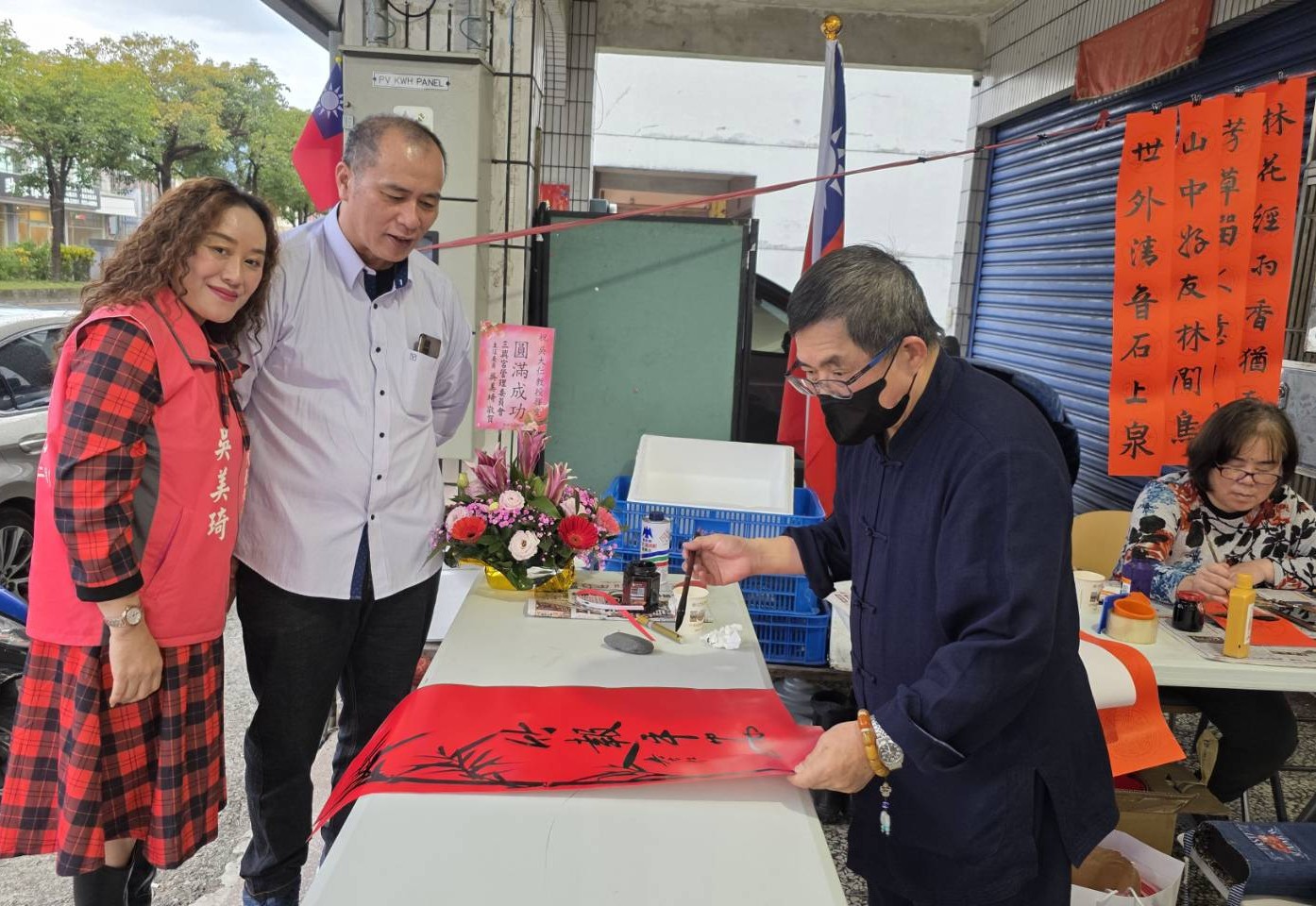 蕭聰池也很開心。他表示,能夠邀請到也是宜蘭鄉親的書法大師吳大仁,風塵僕僕來到窮鄉僻壤吳沙村揮毫送春聯,實在太感動了。他代表鄉親向吳大師表達誠摰的感謝之意。