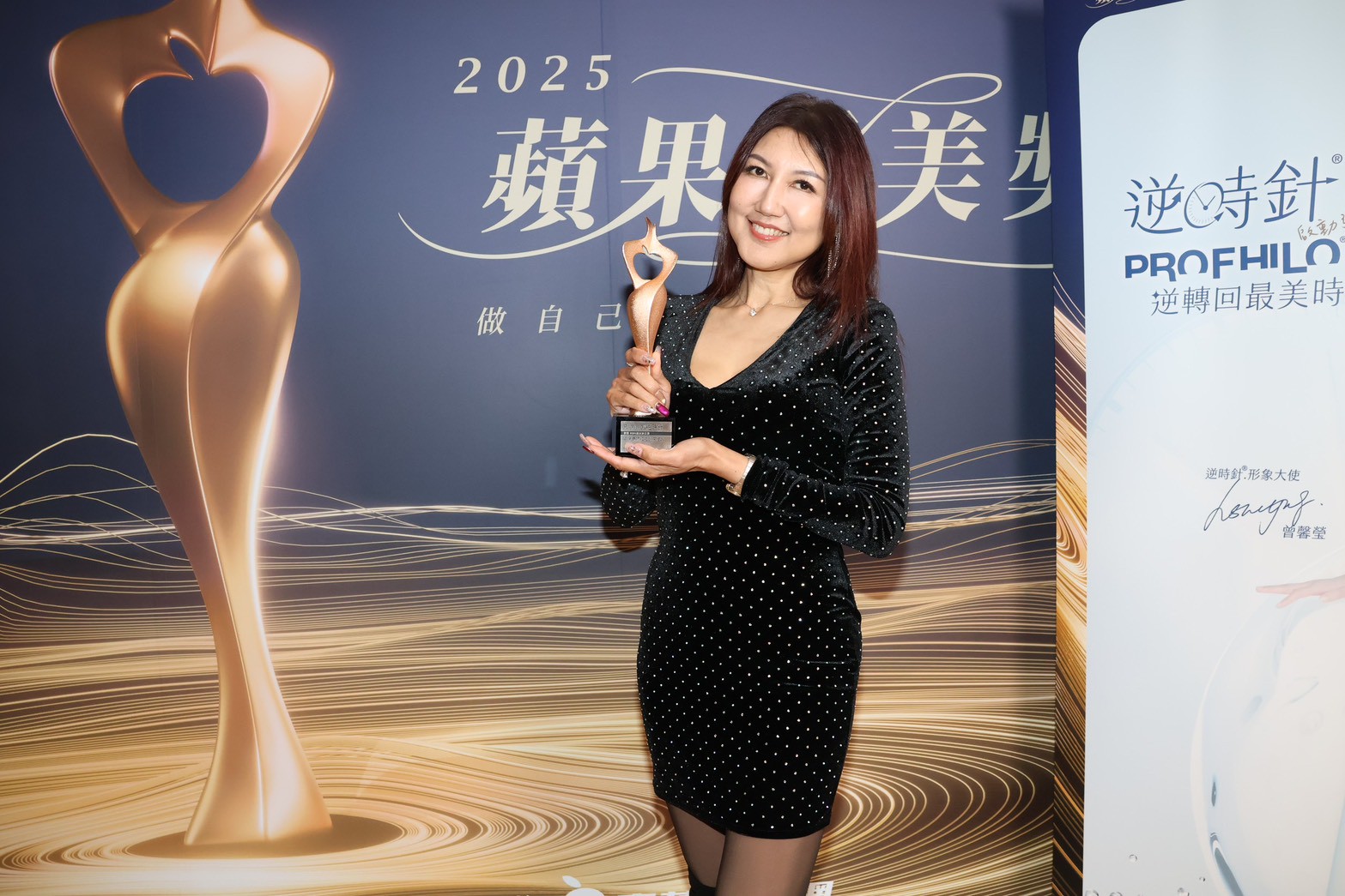 台灣首場大型醫美頒獎典禮「蘋果愛美獎」於11月27日圓滿落幕,現場星光熠熠,也匯聚醫美產業各領域的優秀品牌與專家。由可若夫生技代理的 PROFHILO 逆時針表現亮眼,一舉拿下「愛美人氣獎」、「年度廣告眼球獎」、「年度膠原新生最佳品牌獎」以及「年度最爆紅逆齡療程獎」四大殊榮,董事長馬淑娟(娜娜總裁)表示,感謝大家對PROFHILO逆時針的喜愛,市面上疑似出現山寨與水貨,恐危害療程安全,呼籲民眾施打前務必落實3確認+1掃描,也希望民眾可以把盒子帶回,防止外盒重複使用外,以利後續安心查證。