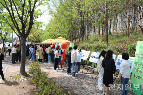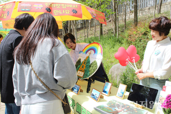 2025年4月17日,新天地彼得枝派光州教會所屬光山地區婦女會與宣傳團隊在光州市光山區雲南洞展開街頭宣傳活動。圖為市民參觀錫安基督教宣教中心結業典禮照片展。(圖片提供:新天地光州教會)