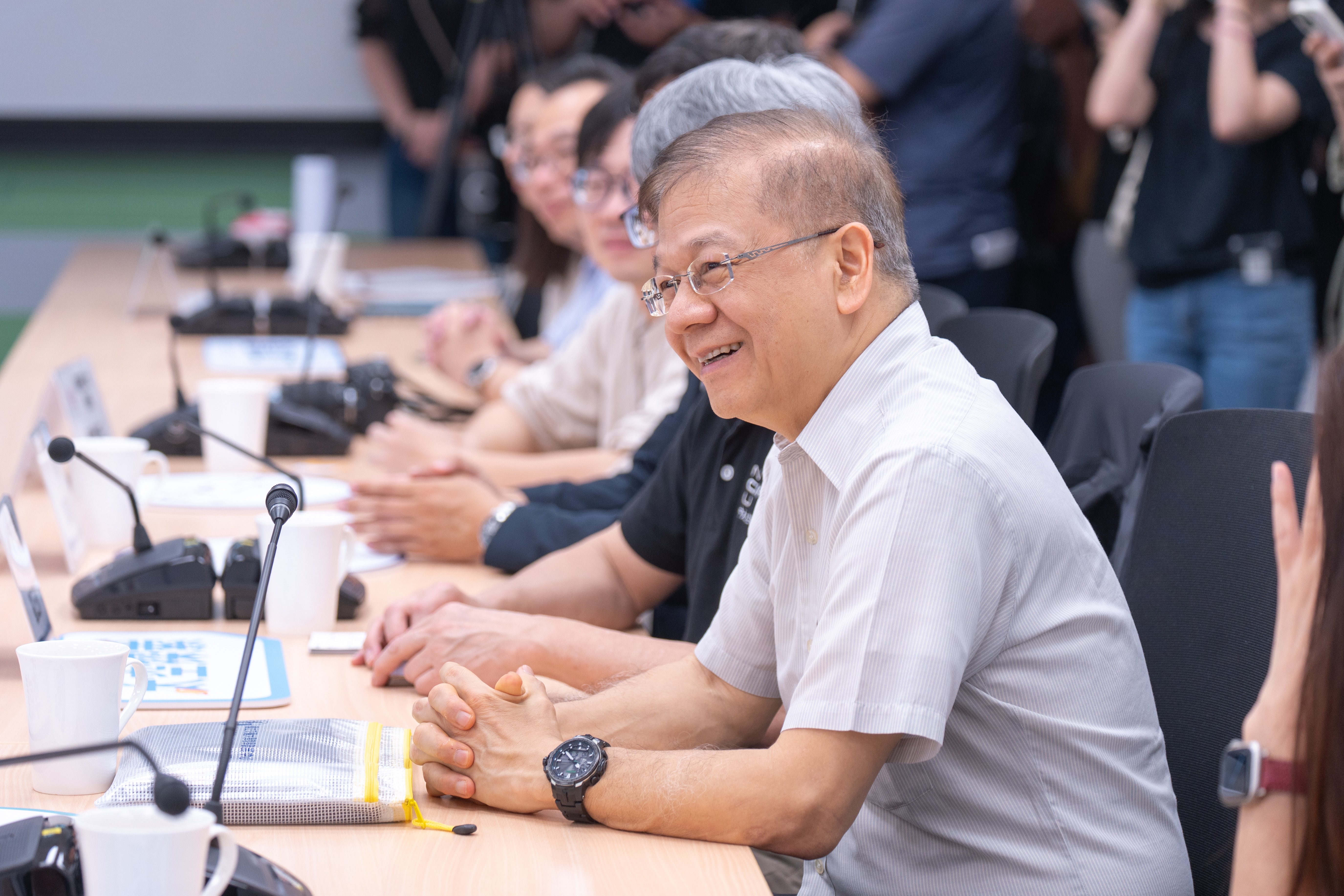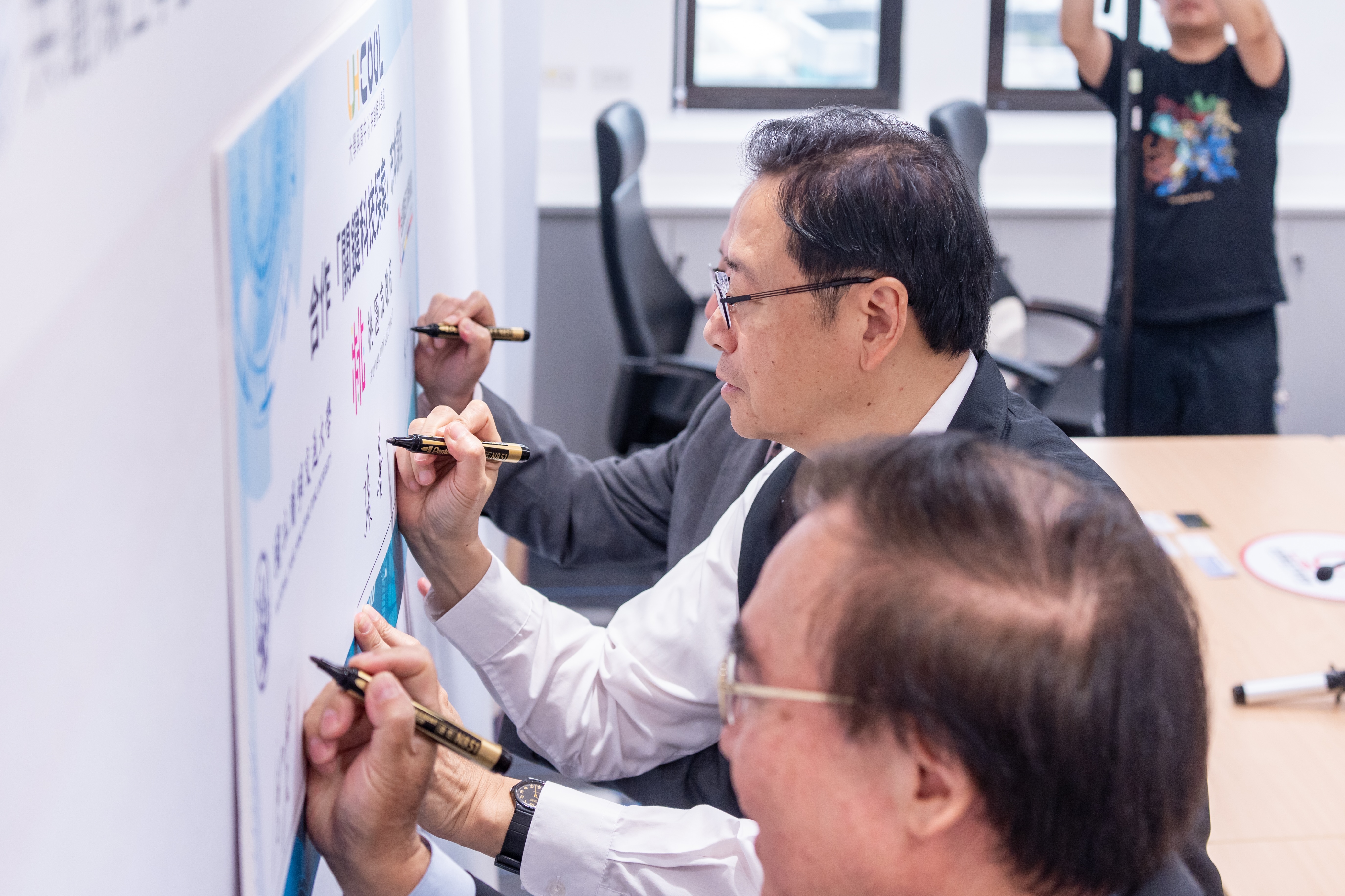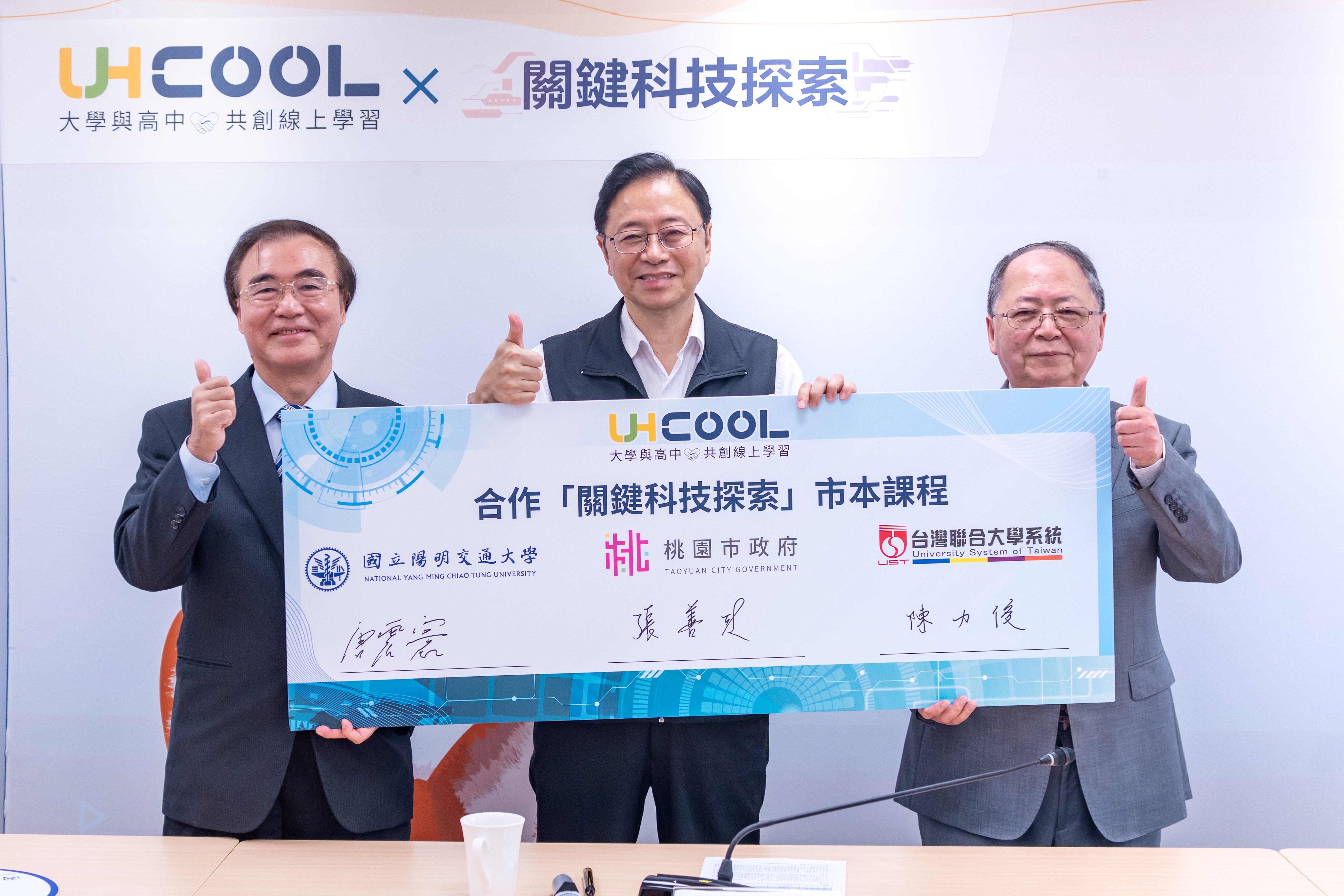 今日包括市府教育局長劉仲成、臺灣聯合大學系統主席陳力俊、國立陽明交通大學副校長唐震寰、國立中央大學副校長顏上堯、國立政治大學副教務長廖興中、國家太空中心總監鄭琮生、應用劇本實驗室總監林文綺、武陵高中校長林煥周、桃園高中校長徐宗盛、內壢高中校長蘇鴻銘、陽明高中校長林裕豐、豐達科技董事長蔡豐賜及精誠資訊科技副總經理吳文舜等均一同出席。