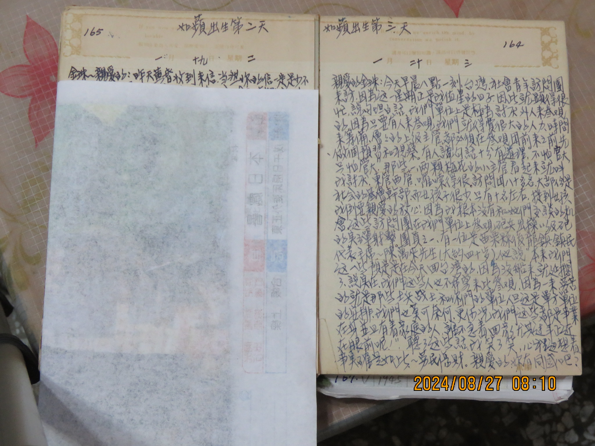 https://tnews.cc/049/newscon208792.htm ),找到了這一本民國59(1970)年12月3日(距離退伍還有212天),到民國60(1971)年7月6日(退伍後第3天,上船回台灣)的日記。在這本日記裡,幾乎都是每天寫給親愛王金珠太太的信,共有199封【60(1971)年 2月1日到2月16日,我回台灣,這16天沒寫日記】。