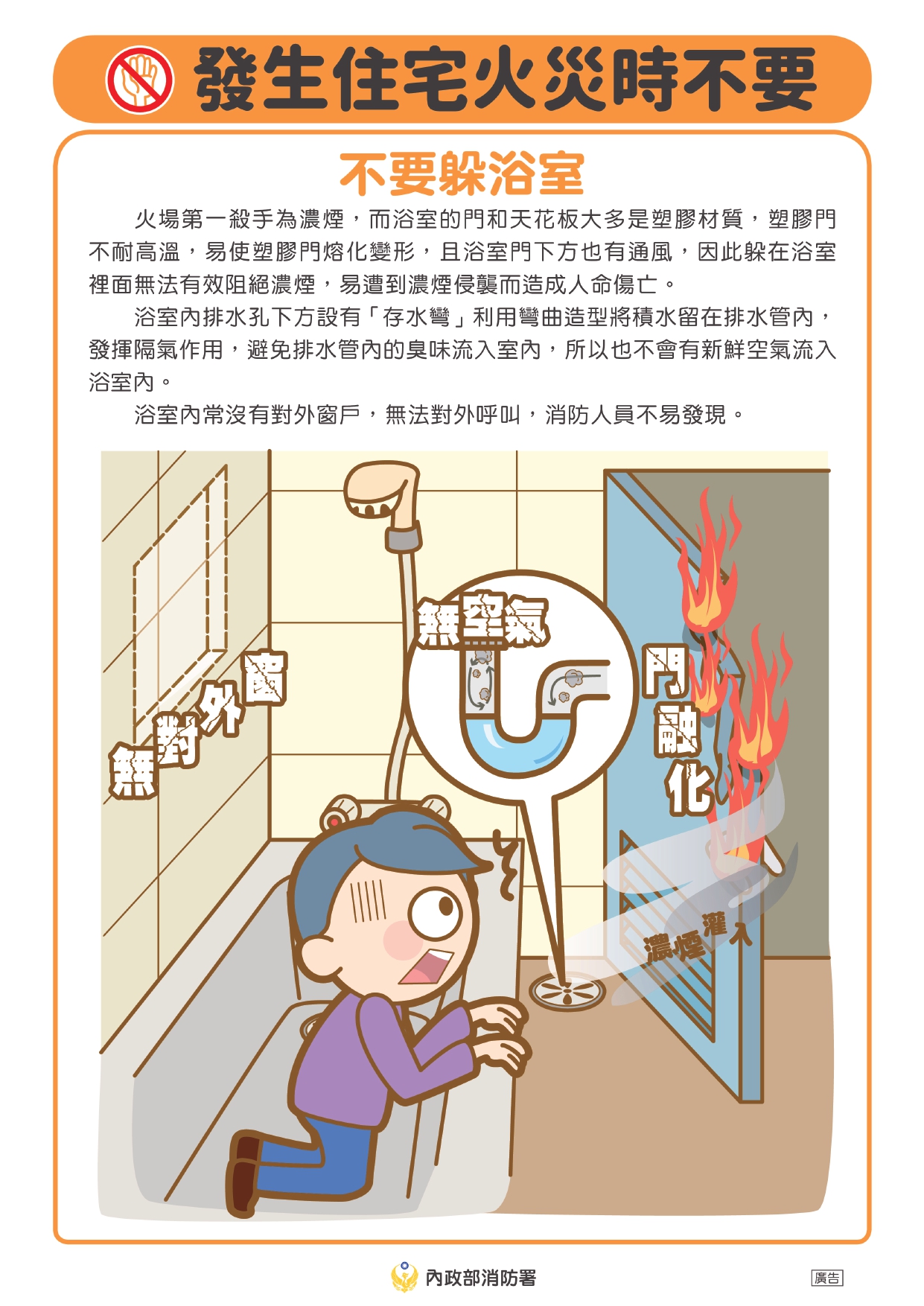 火災發生時,許多人因為恐慌,會選擇躲進浴室,誤認為浴室有水比較安全。