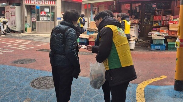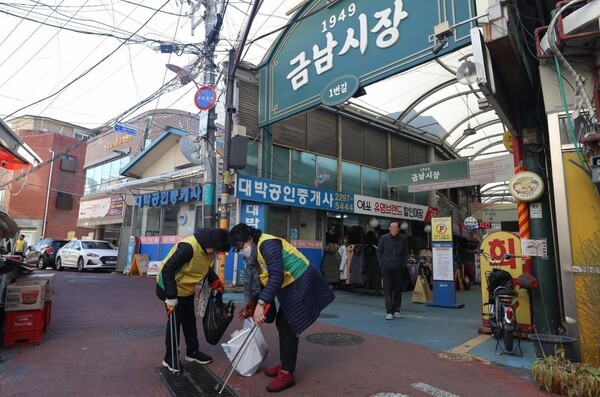 2025年2月15日,於首爾城東區琴南市場,新天地志工服務團城東分部成員正在市場入口進行垃圾清理。(照片提供:新天地志工服務團城東分部)
