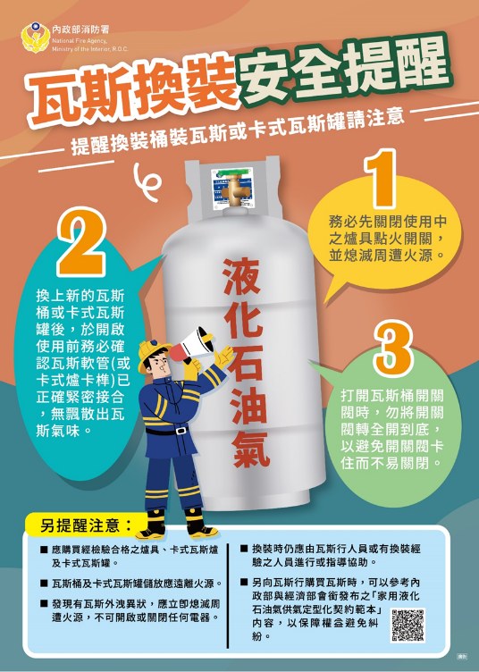 天冷圍爐增加瓦斯用量,提醒民眾,為避免災害發生如換裝桶裝瓦斯或卡式瓦斯罐要注意事項![]()