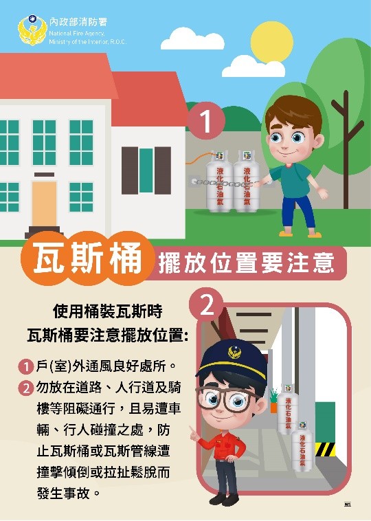 3.瓦斯桶應放置於屋外通風良好處,且要定期及適時更換瓦斯軟管及相關配件。![]()