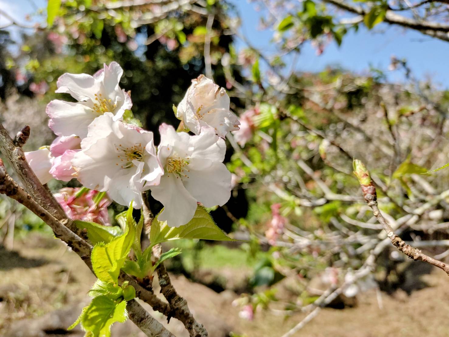 「春神來了,花知道!」,連日嚴寒乍晴,太陽露臉,財仔溪花園的百花盛開,慢半拍的日本「染井櫻」一群獨秀,隨著春風吹拂,花枝展含笑迎賓。
