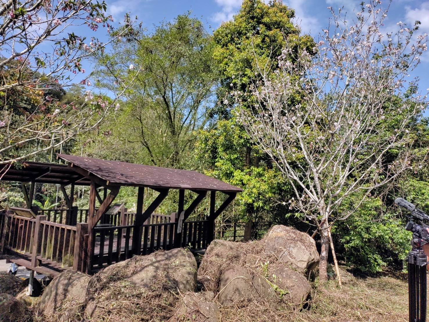 圖三財仔溪溪畔木構亭旁的染井櫻盛開。(記者林凌霄攝 )