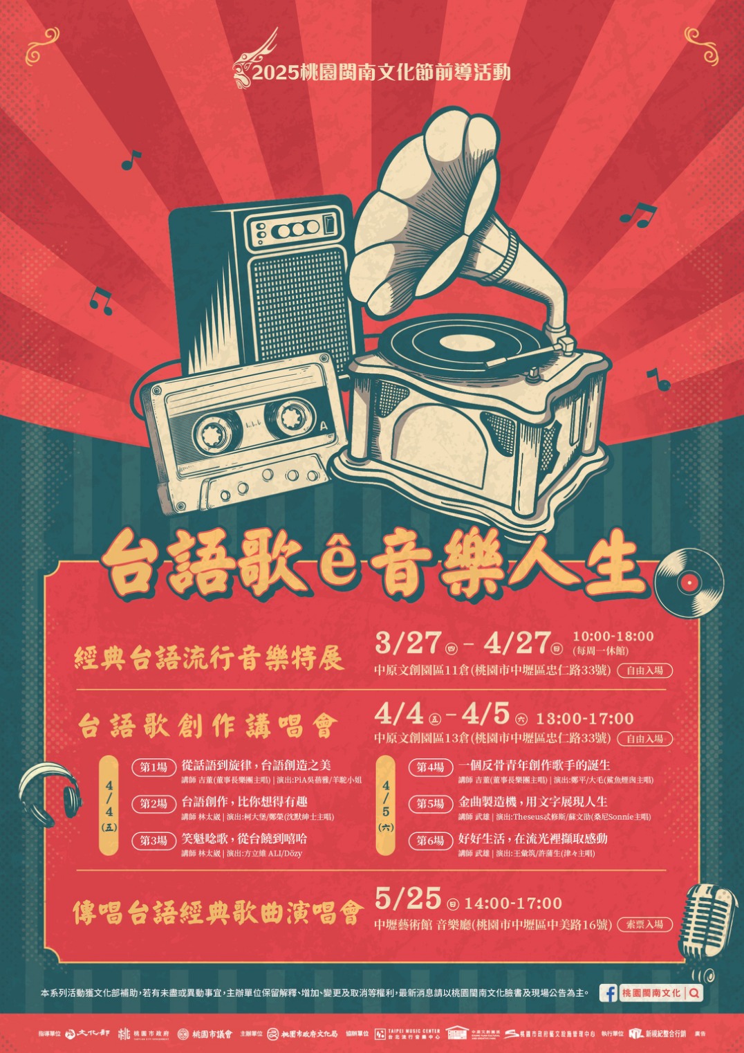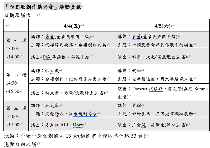 2025桃園閩南文化節推出「台語歌ê音樂人生」一系列前導活動,6場「台語歌創作講唱會」於4月4日至5日,一連兩天在中壢中原文創園區13倉舉行,董事長樂團主唱吉董、老曲盤收藏家林太崴、資深作詞人武雄,將為民眾解說台語歌創作之美,還有知名音樂人與歷屆桃園熱音賞得獎者互相交流,機會難得,歡迎大家把握機會來參加。