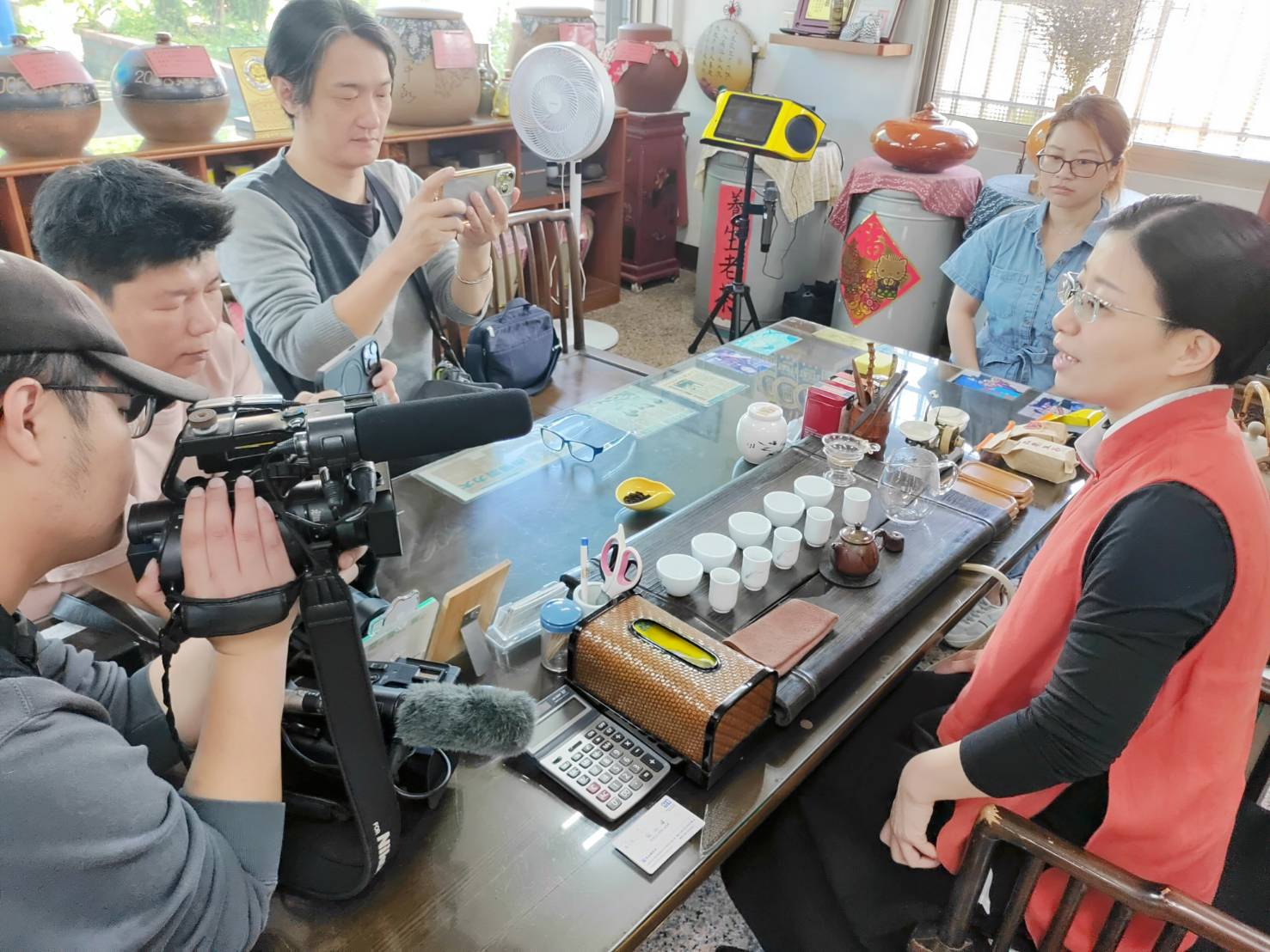 圖五仙品茶銀行執行長黃玫桂( 右2)、店長林淑君(右1)接受電媒體專訪。(記者林凌霄攝 )