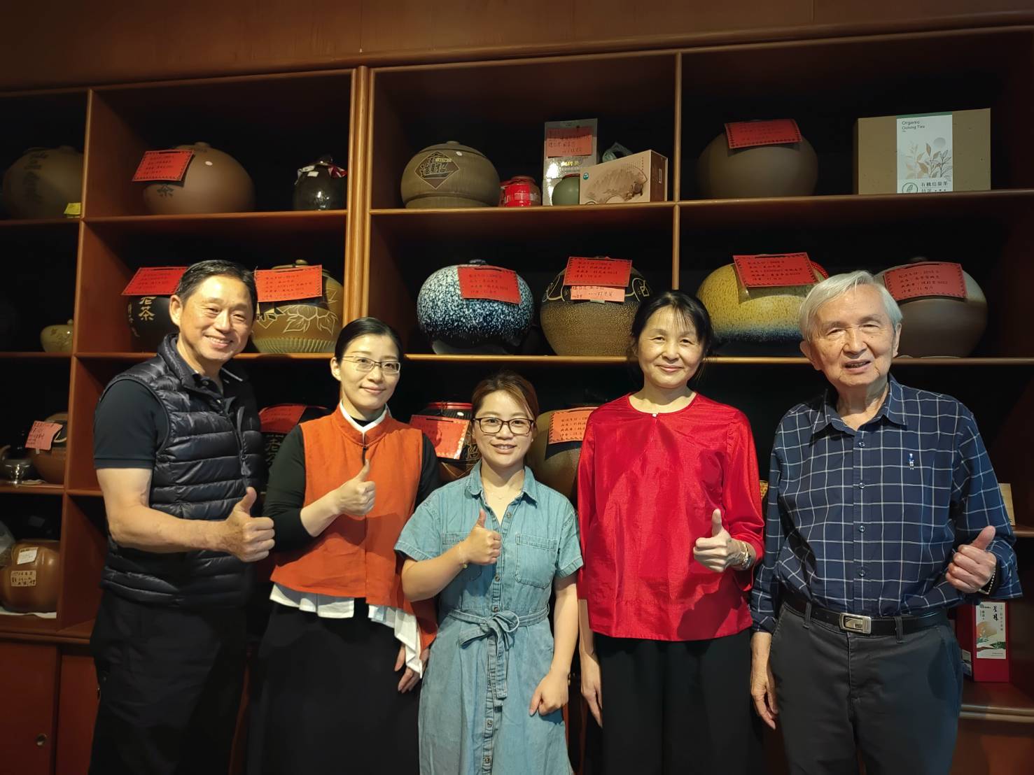 圖一仙品茶銀行執行長黃玫桂( 左3)、店長林淑君(左2)與客戶在琳瑯滿目的陳列室合影。(記者林凌霄攝 )