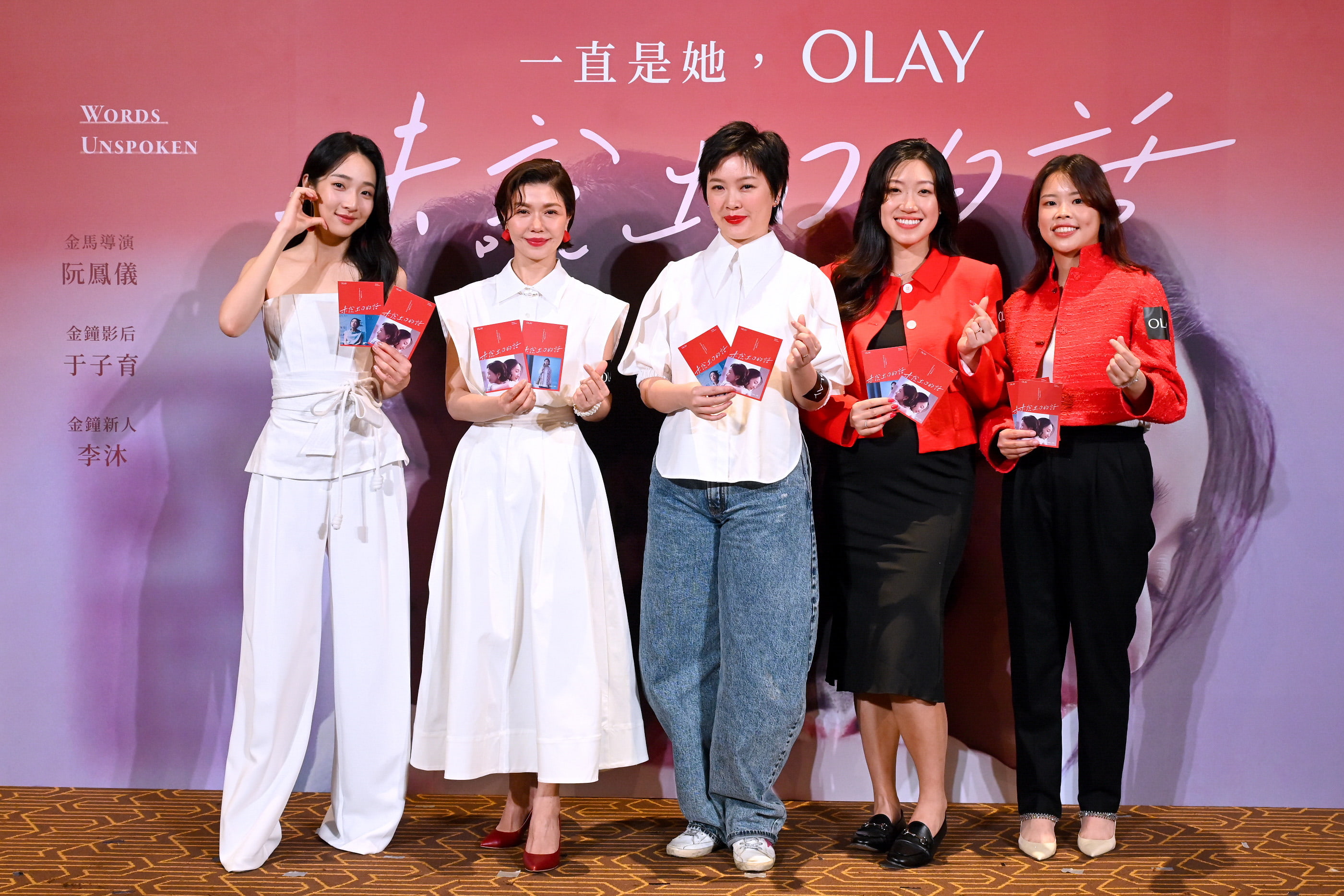 圖說:OLAY資深品牌經理楊昕(右起)、OLAY香港台灣品牌總經理Jia、導演阮鳳儀、演員于子育、李沐一同出席首映。