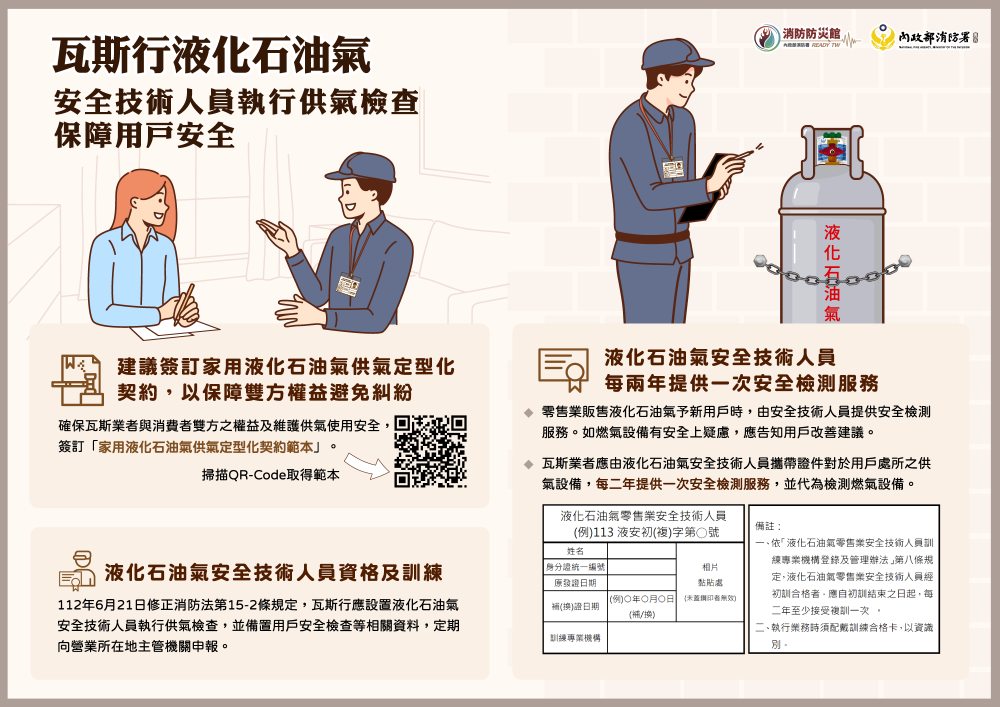 112年6月21日修正消防法第15-2條,規定瓦斯行應設置液化石油氣安全技術人員執行供氣檢查,並備置用戶安全檢查等相關資料,定期向營業所在地消防機關申報。