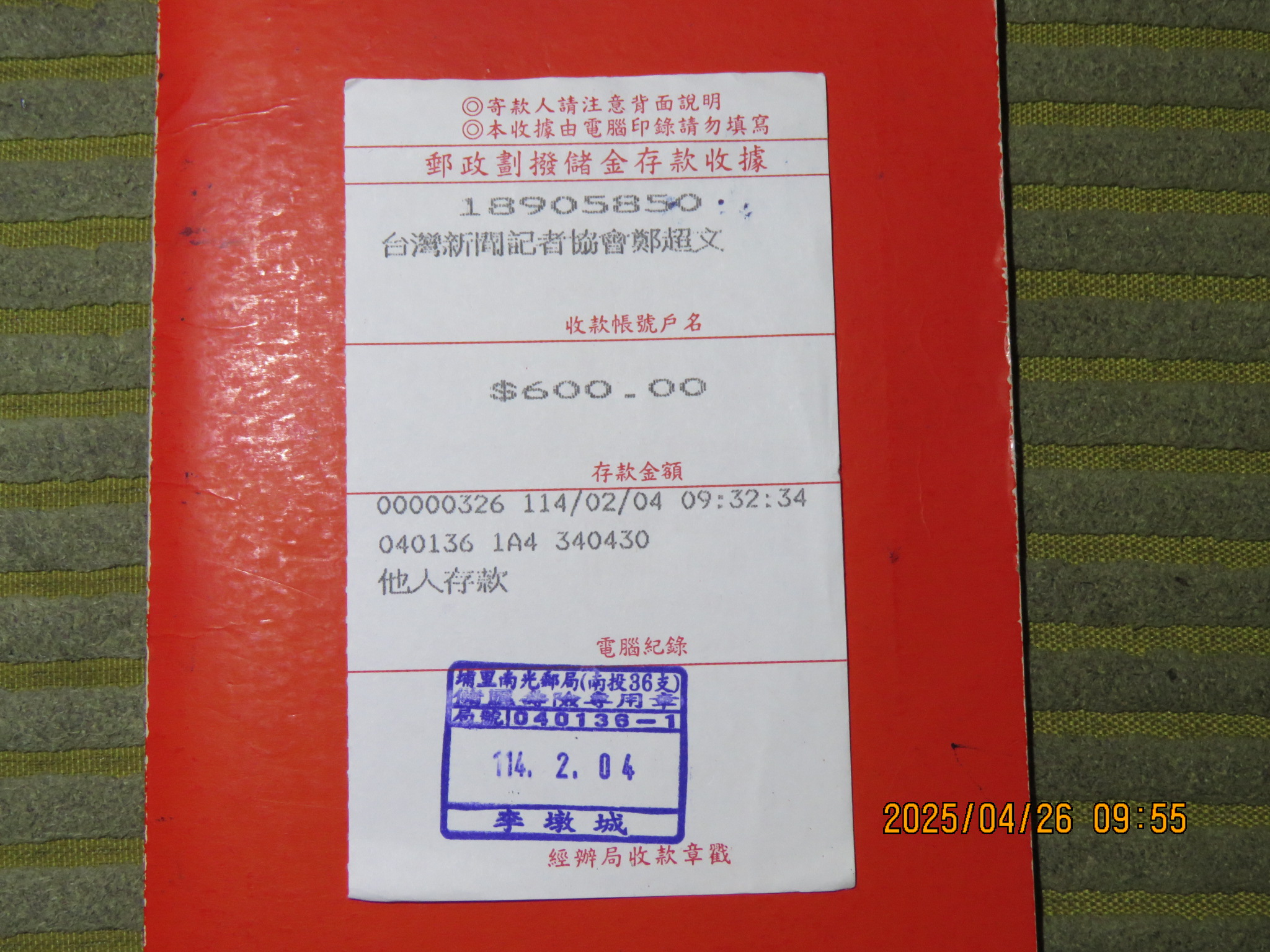 台灣新聞記者協會 民國114年郵政劃撥繳費收據。