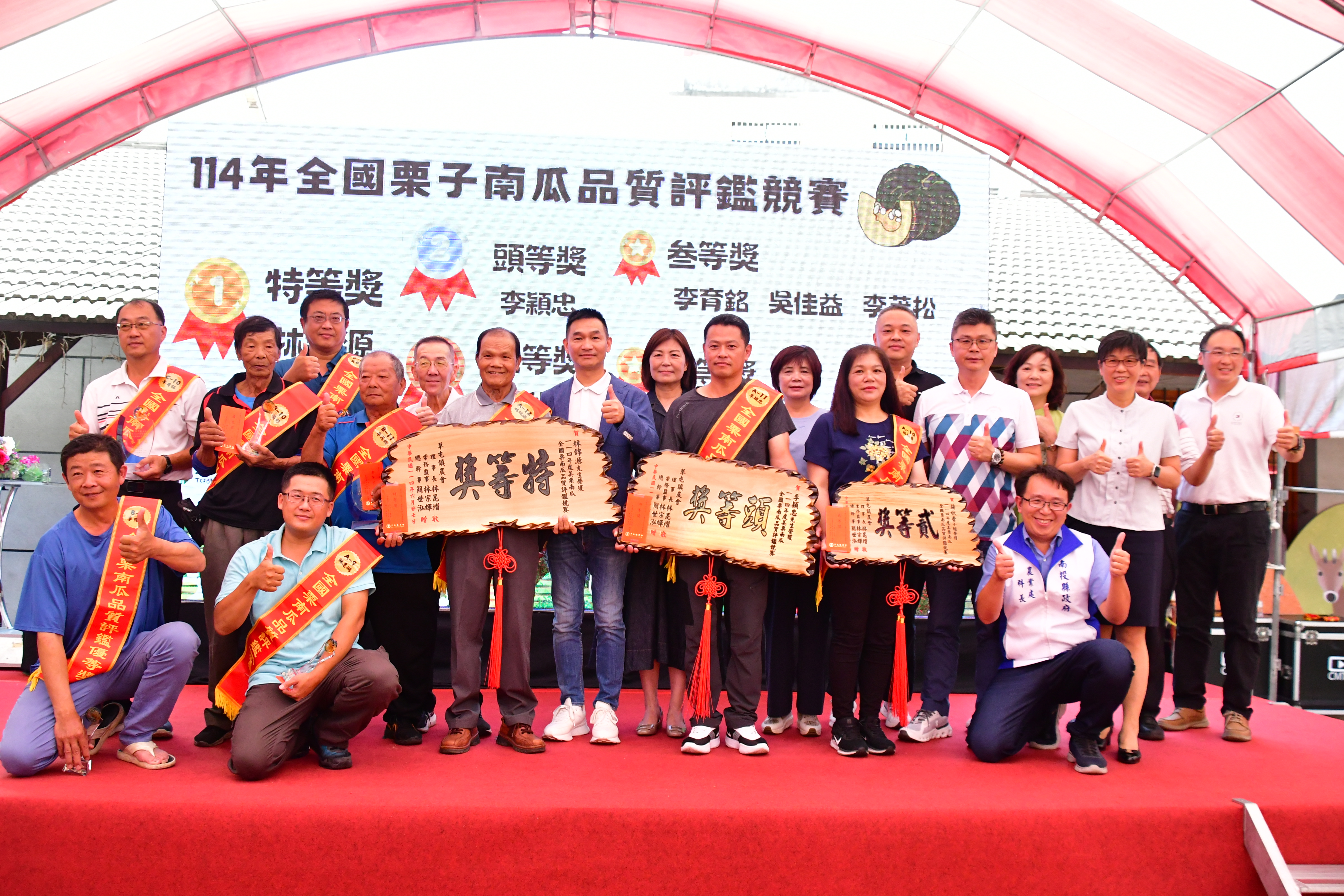 圖一草屯鎮農會頒獎表揚114年 全國栗子南瓜品質評鑑競賽等得獎者 合影。(草屯鎮農會提供)