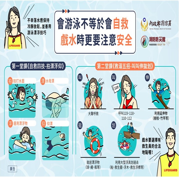 暑假即將到來,在安排玩水活動前,要記得水域安全觀念《會游泳不等於會自救、戲水時更要注意安全》,牢記《自救四技、救溺五招》才能避免憾事發生喔!