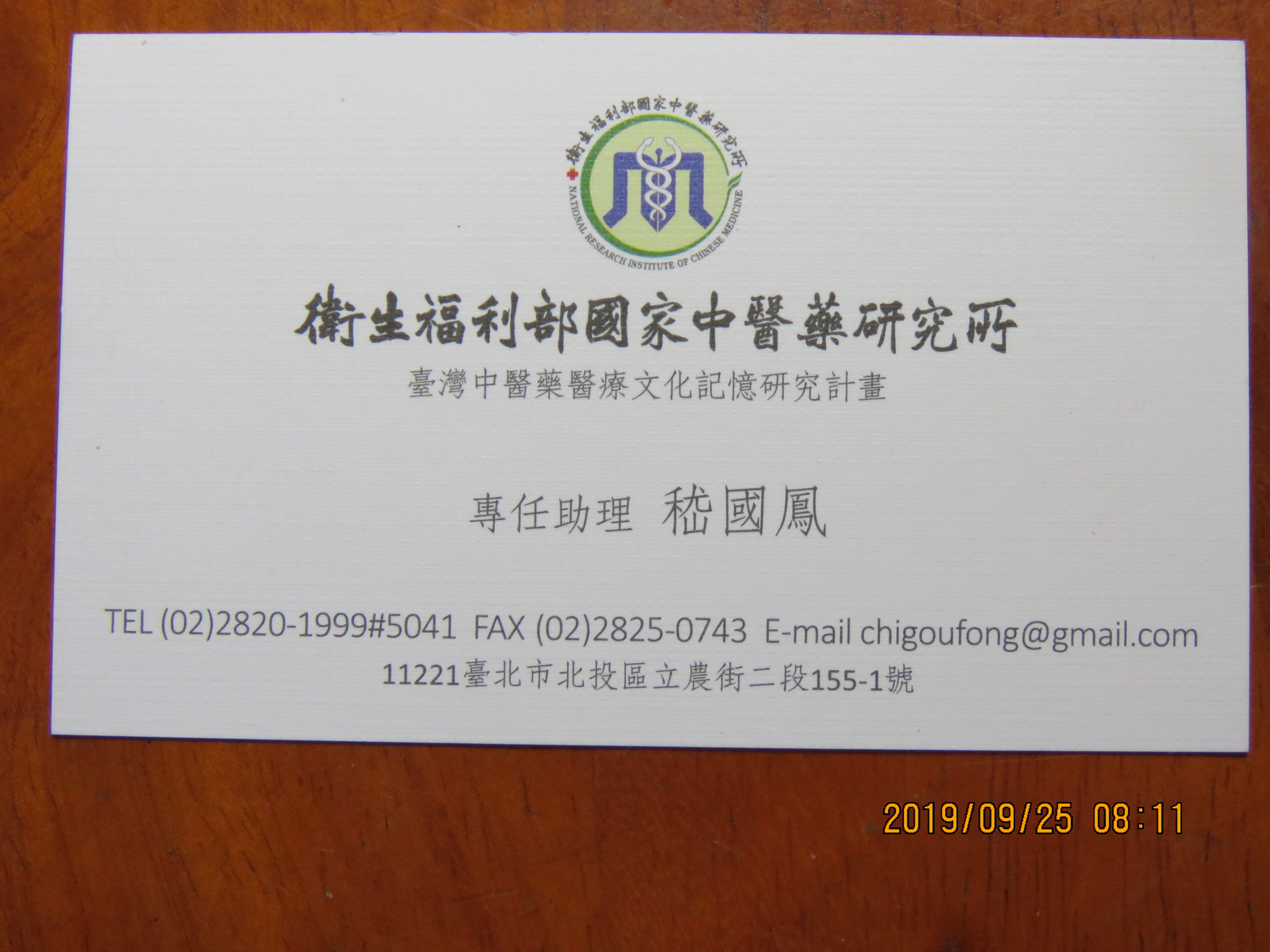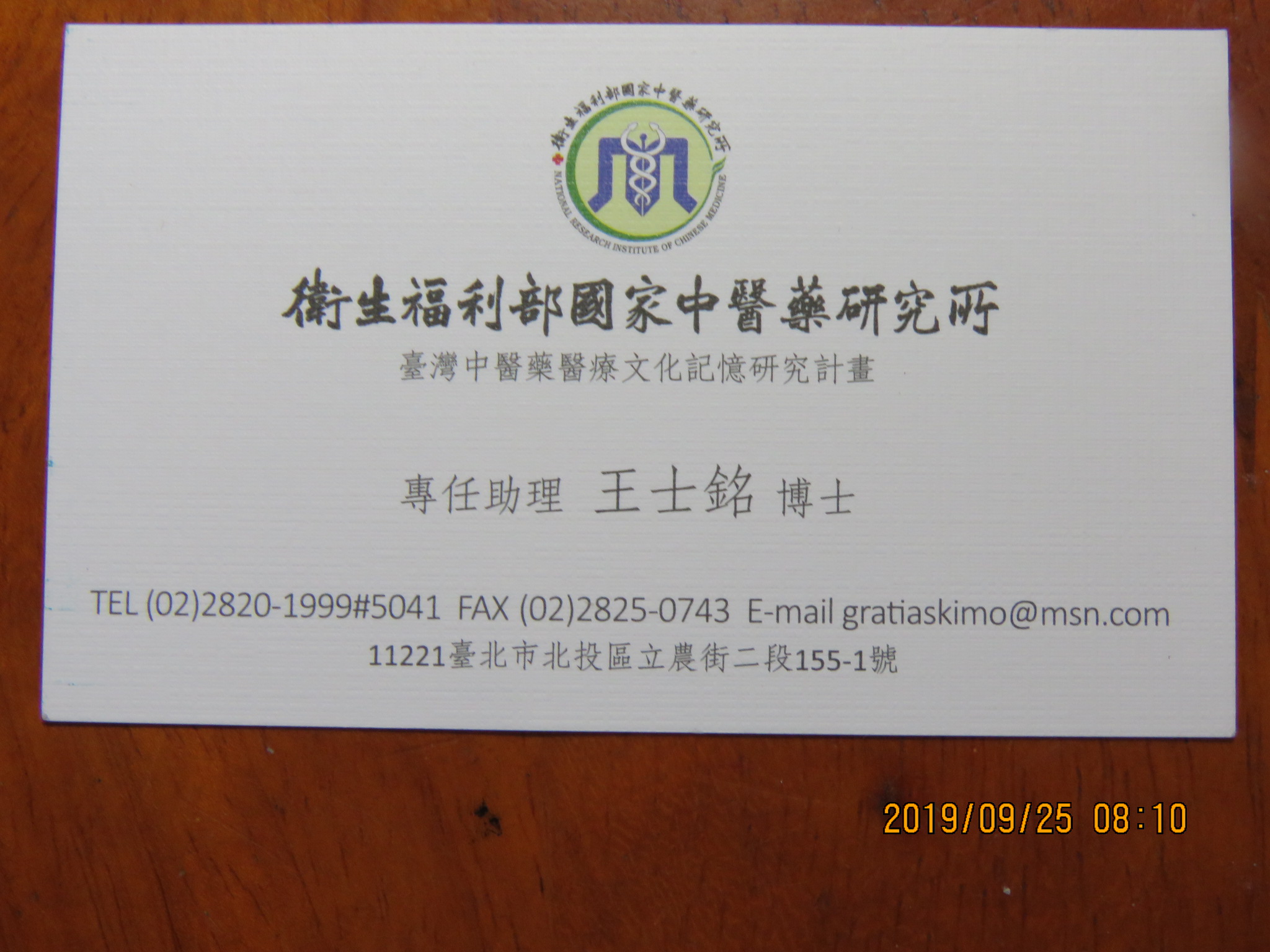 行政院衛生福利部、國家中醫藥研究所,專任助理王士銘、嵇國鳳﹙見名片照片﹚,受行政院文化部~台灣中醫藥醫療文化記憶研究計劃﹙2019~2020﹚之委託,於2019﹙108﹚.09.24.﹙己亥.08.26.﹚星期二13:54~16:00,專程由台北市前來南投縣埔里鎮麒麟里武界路9之12號,專訪祖傳八代老中藥舖已退休經營者~張友道﹙玄德﹚、王金珠﹙妙圓﹚,臨回台北市前,四人在玄孝院合影留念。