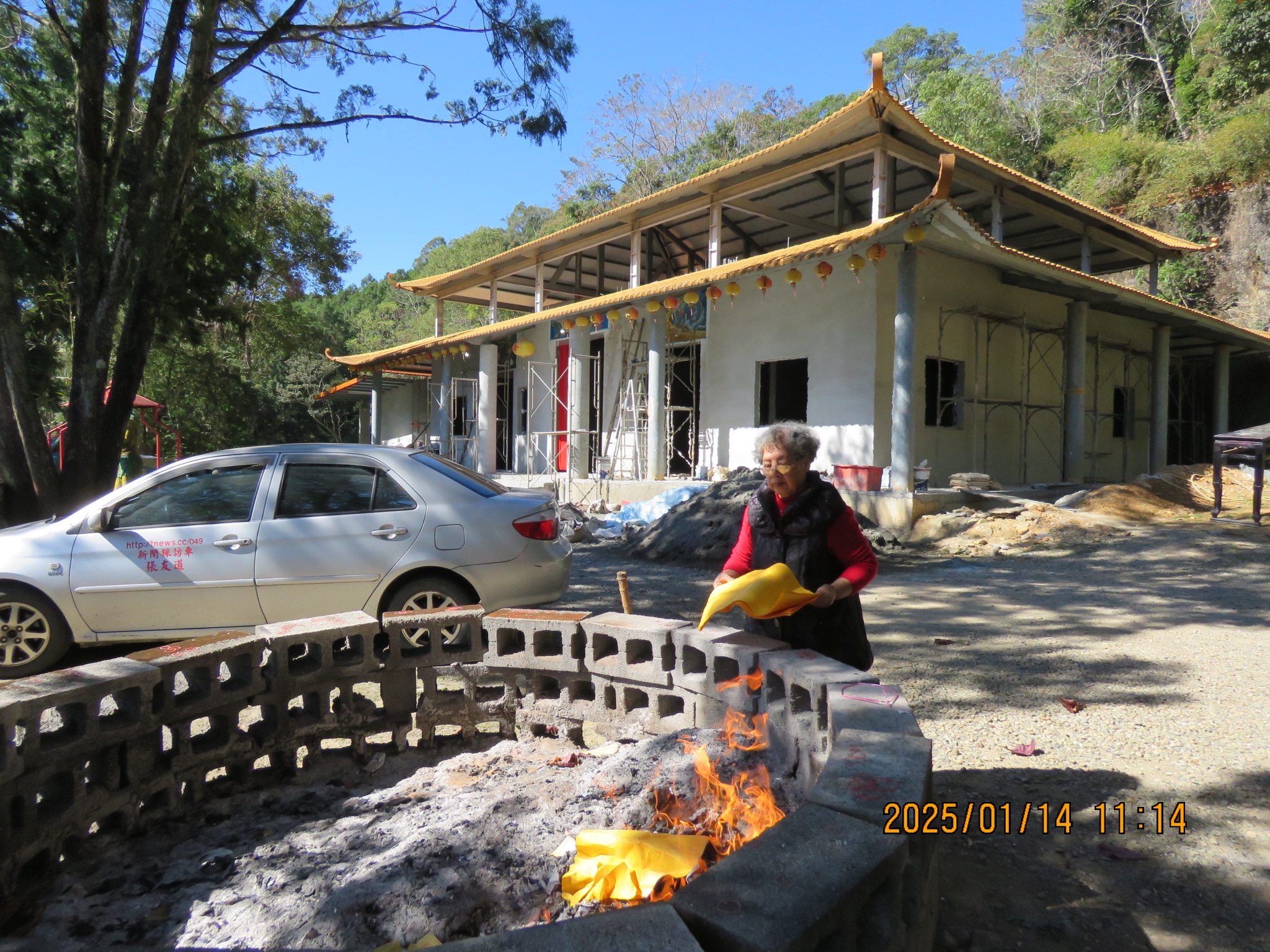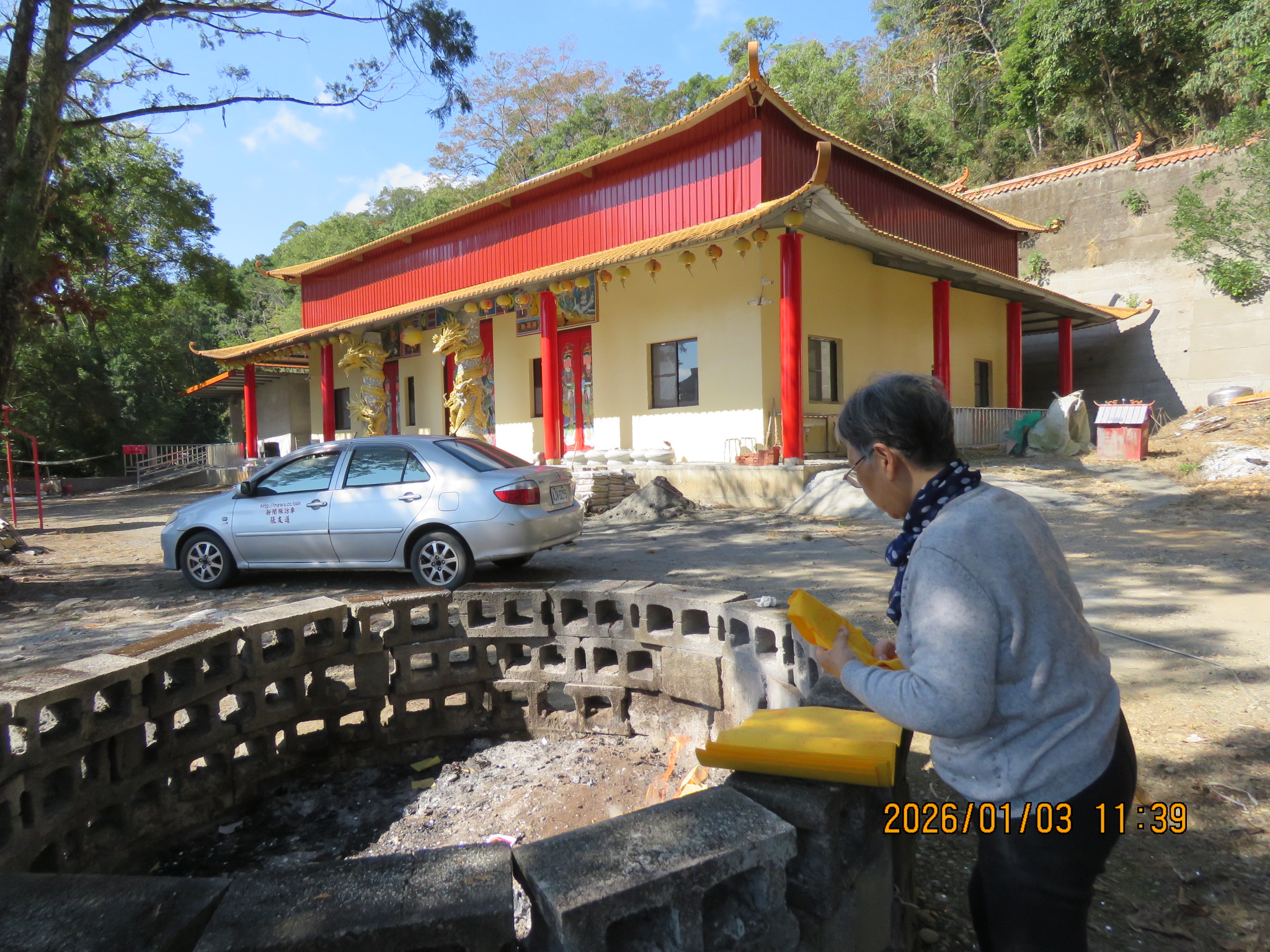 2025(114).01.14.(甲辰.12.15.) 星期二( 第7次照片,第357天),張友道、王金珠抵達埔里金華殿,焚化共15日(甲辰.12.01.~甲辰.12.15.)、45張(3張X15)的『無形文』功課、作業,交給 瑤池金母娘娘主席,恭請 鑑核!(第24次呈繳無形疏文)