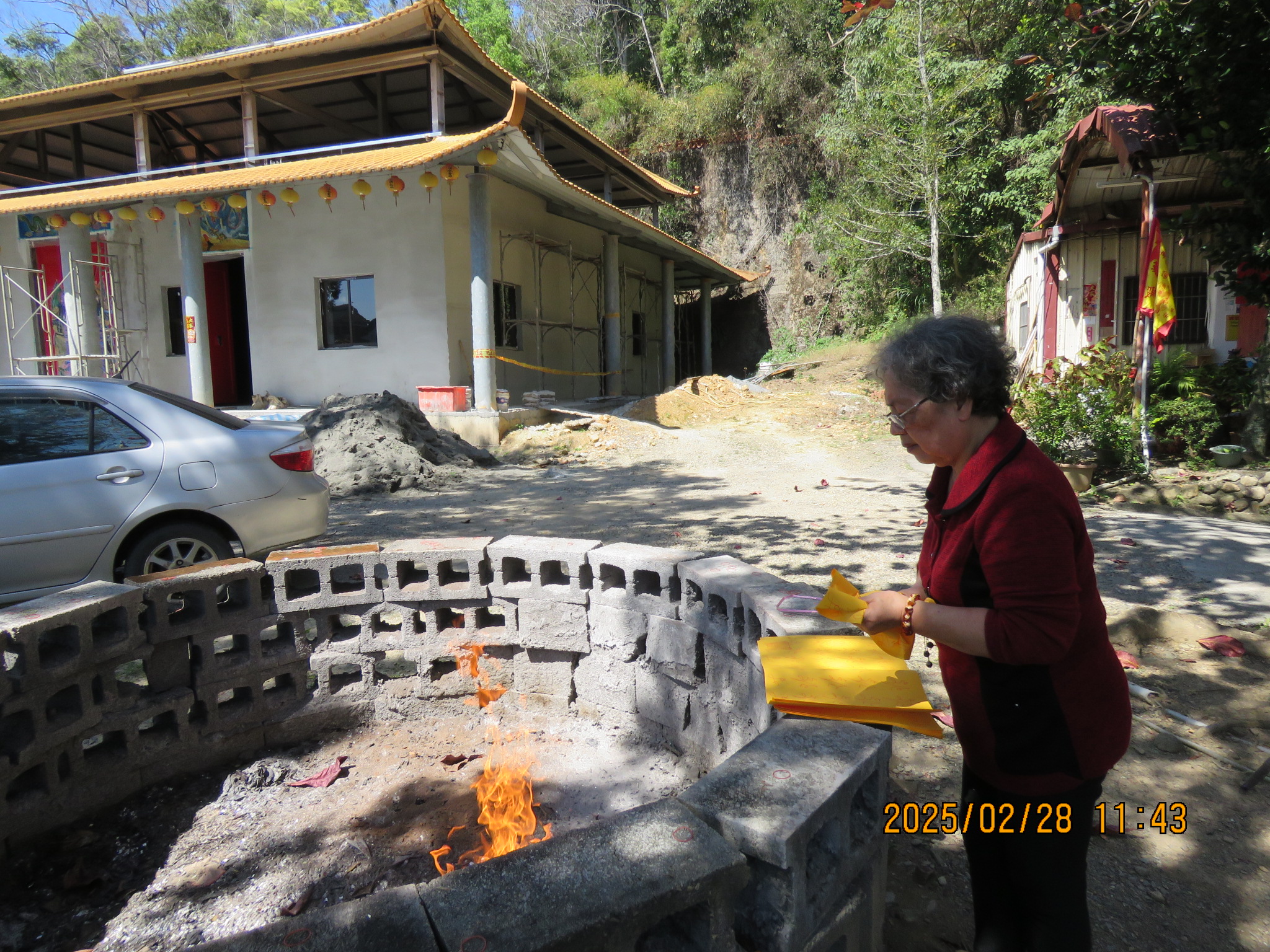2025(114).02.28.(乙巳.02.01.) 星期五( 第7次照片,第402天),張友道、王金珠抵達埔里金華殿,焚化共15日(乙巳.01.16.~乙巳.02.01.)、45張(3張X15)的『無形文』功課、作業,交給 瑤池金母娘娘主席,恭請 鑑核!(第27次呈繳無形疏文)