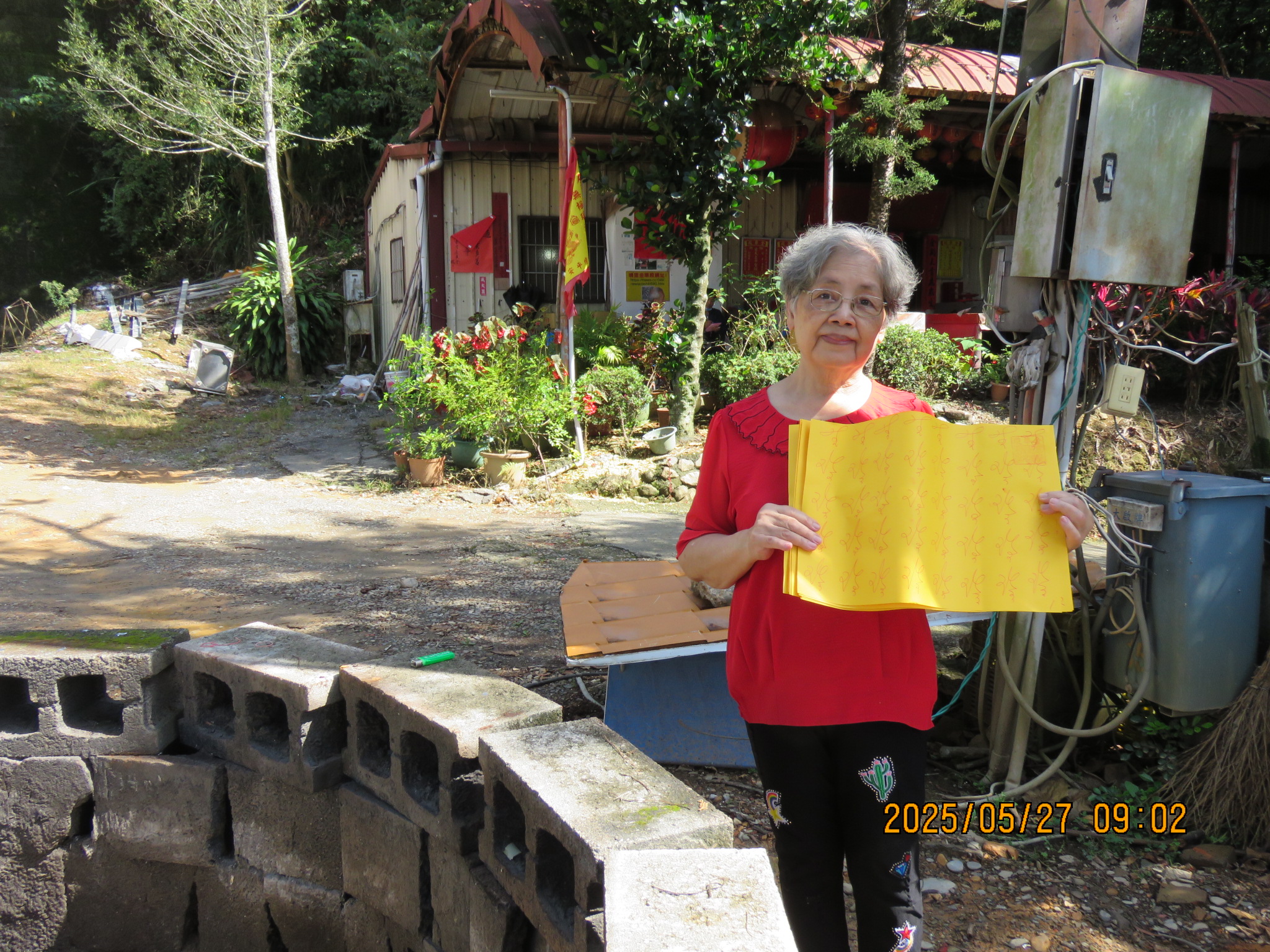 2025(114).05.27.(乙巳.05.01.) 星期二( 第7次照片,第490天),張友道、王金珠抵達埔里金華殿,焚化共15日(乙巳.04.16.~乙巳.05.01.)、45張(3張X15)的『無形文』功課、作業,交給 瑤池金母娘娘主席,恭請 鑑核!(第33次呈繳無形疏文)