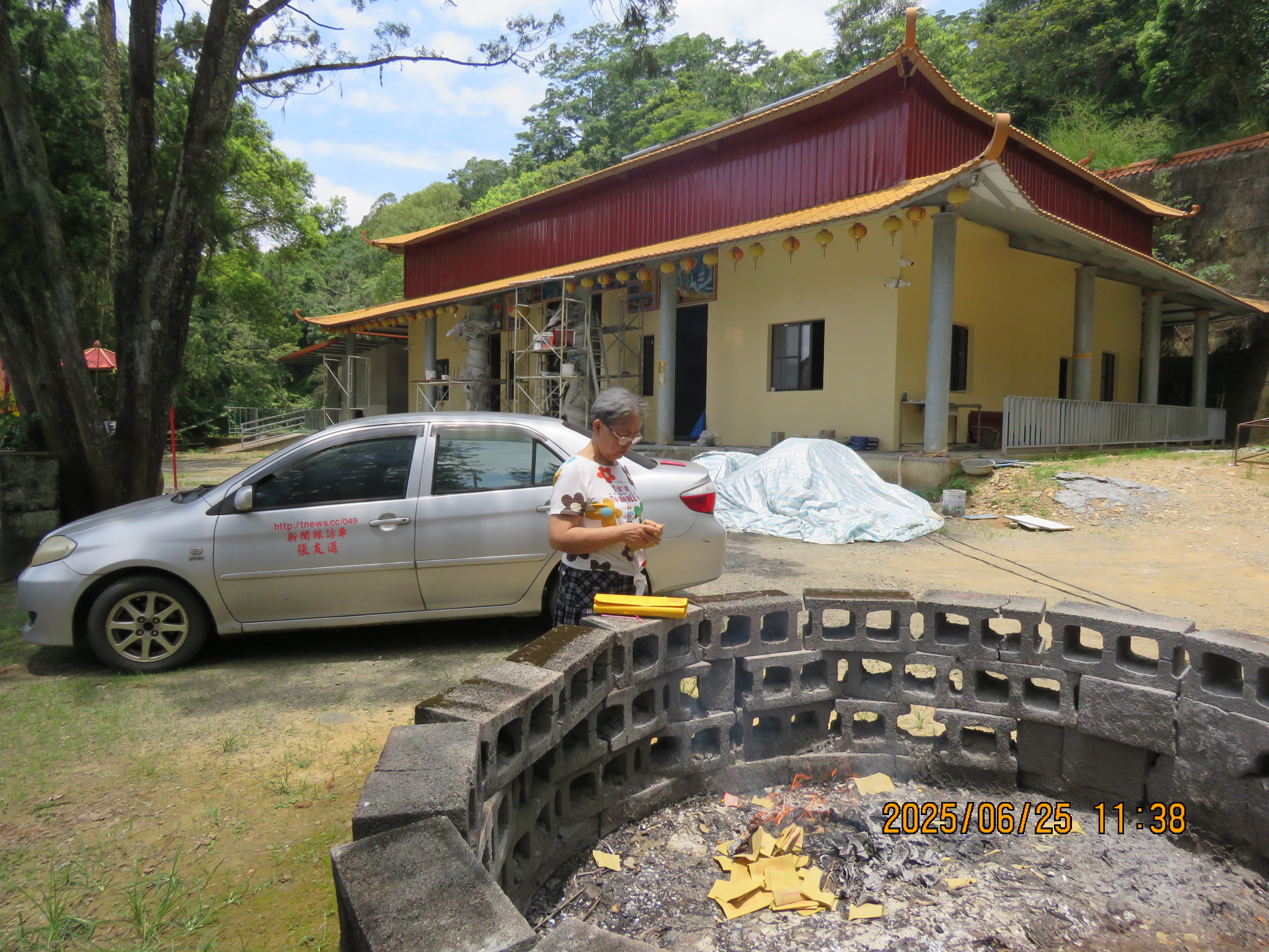 2025(114).06.25.(乙巳.06.01.) 星期三( 第7次照片,第519天),張友道、王金珠抵達埔里金華殿,焚化共15日(乙巳.05.16.~乙巳.06.01.)、45張(3張X15)的『無形文』功課、作業,交給 瑤池金母娘娘主席,恭請 鑑核!(第35次呈繳無形疏文)