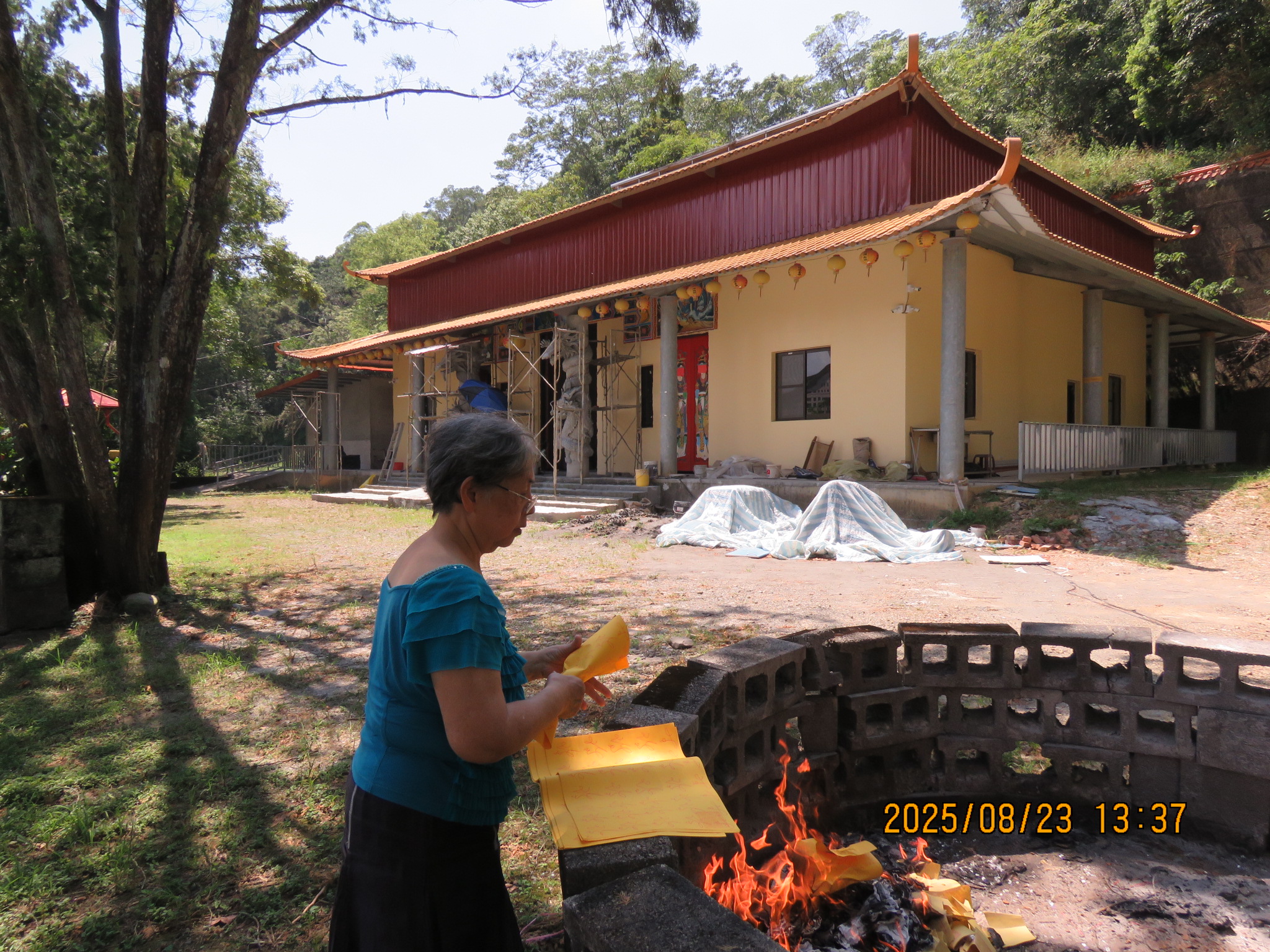 2025(114).08.23.(乙巳.07.01.) 星期六( 第7次照片,第578天),張友道、王金珠抵達埔里金華殿,焚化共15日(乙巳.潤6.16.~乙巳.07.01.)、45張(3張X15)的『無形文』功課、作業,交給 瑤池金母娘娘主席,恭請 鑑核!(第39次呈繳無形疏文)