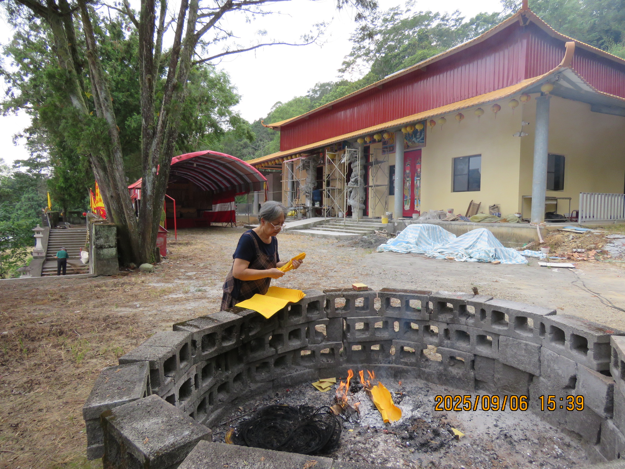 2025(114).09.06.(乙巳.07.15.) 星期六( 第7次照片,第592天),張友道、王金珠抵達埔里金華殿,焚化共15日(乙巳.07.02.~乙巳.07.15.)、45張(3張X15)的『無形文』功課、作業,交給 瑤池金母娘娘主席,恭請 鑑核!(第40次呈繳無形疏文)