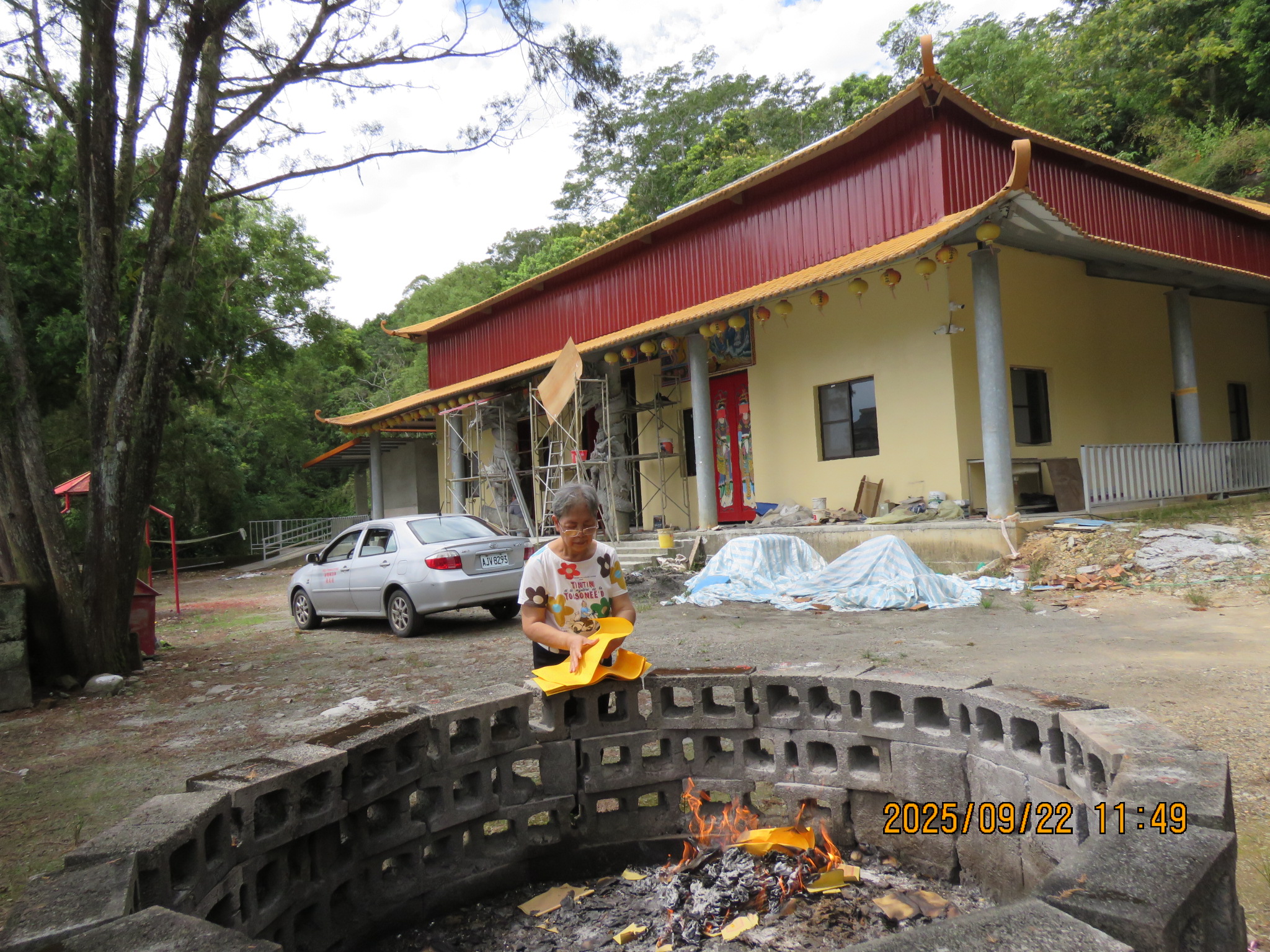 2025(114).09.22.(乙巳.08.01.) 星期一( 第7次照片,第608天),張友道、王金珠抵達埔里金華殿,焚化共15日(乙巳.07.16.~乙巳.08.01.)、45張(3張X15)的『無形文』功課、作業,交給 瑤池金母娘娘主席,恭請 鑑核!(第41次呈繳無形疏文)